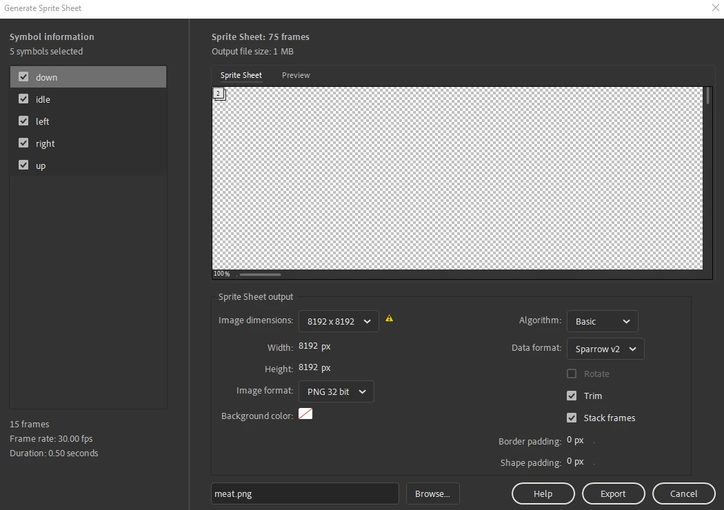 So when I tried to generate sprites that I had made, all of them did not fit on it. I used images that I drew on my iPad as I did not have a drawing tablet. There are alot of empty spaces on the sprite, and there are only 10 sprites when there are supposed to be 16. Is there a way to fix this? My workspace is sparrowV2, max width and heigth, basic algorithm trim and stack frames enabled.