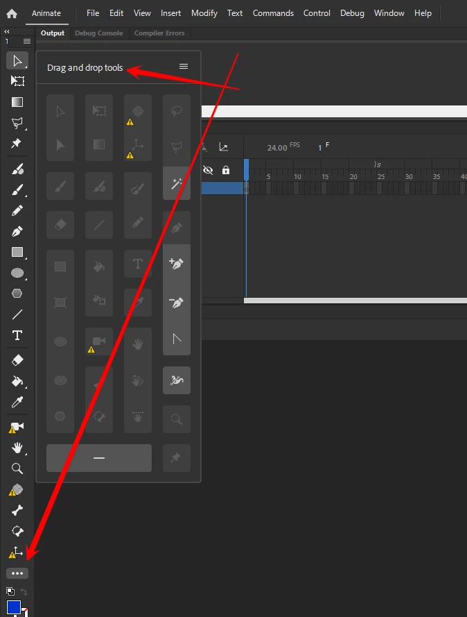 i was following along a tutorial for An and they used the pen tool, but when i tried to select it, the pen tool was completely missing! im pretty new to animate, so sorry for my ignorance. ive attatched an image of what my window looks like.
