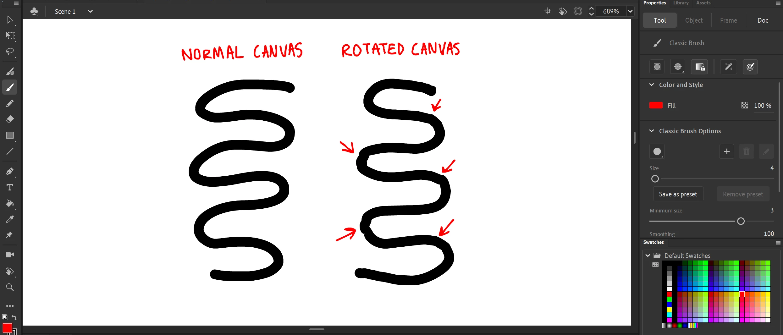 The first issue I have are these line jitters I get when I use the pencil tool, specifically after rotating the canvas or if I work inside of a symbol that has been rotated:
