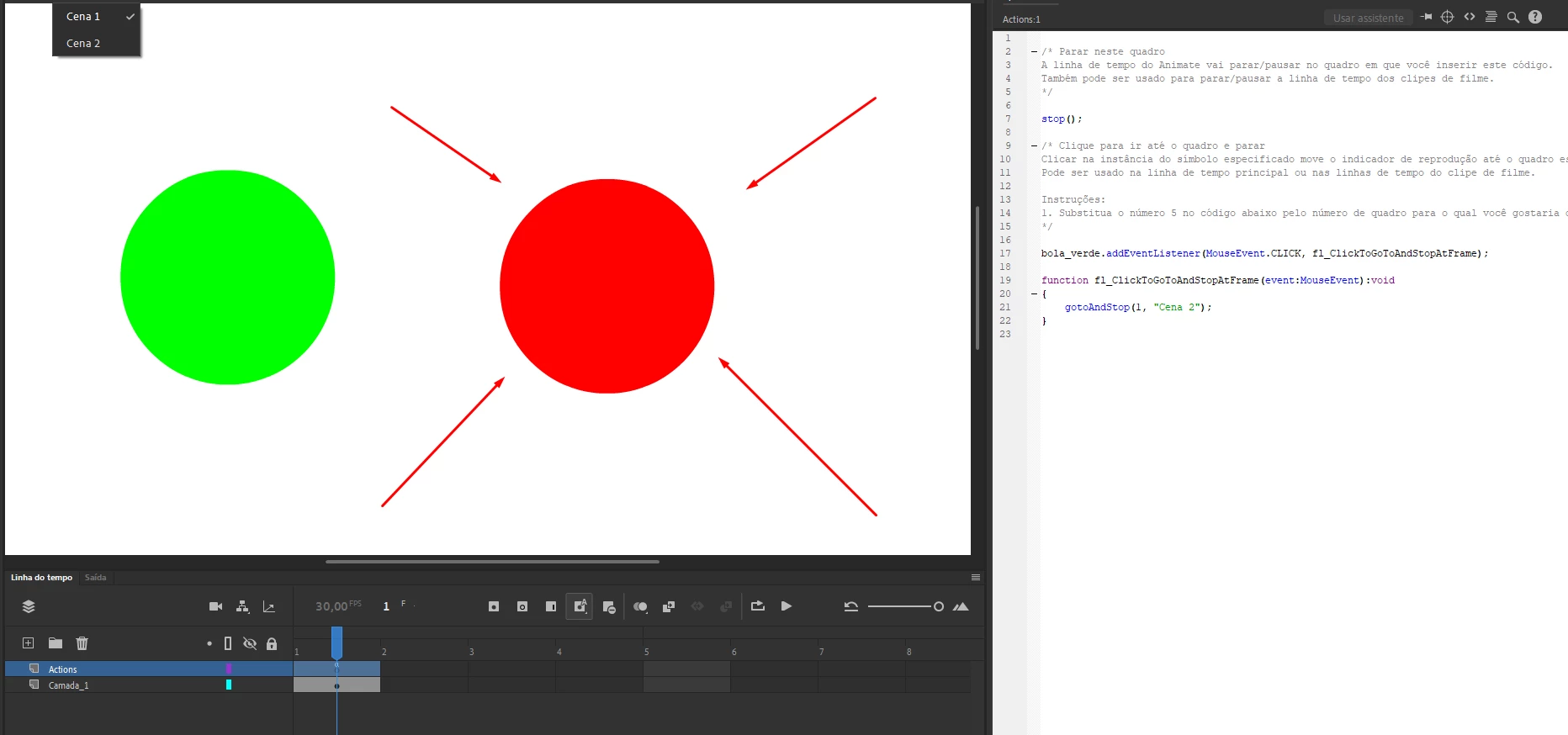 ola tudo bem ? então pessoal quero fazer uma interação usando a (time line) do adobe animate so que não estou conseguindo pode ser uma coisa simples...mais ja tentei de tudo talvez vocês podem min ajudar espero ... é o seguinte o problema é nas cenas eu fiz com bolas para ficar melhor o compreendimento de voçês certo eu quero fazer como se fossem interruptores,,, entre as cenas ou na time line ficar alternando uma na outra ,,,na bola verde i vermelha da cena 1 as duas são um simbolo coloquei como botões ok.... mais quando clicko na bola verde da cena 1 ela vai para minha outra cena que seria a 2 ate ai tudo bem... so que eu quero quando eu fazer essa ação a minha bola vermelha ela possa vir também sabe ? eu quero como se ela fosse uma coisa estatica na cena mais que tambem ela serviria para voltar para cena 1... é como se fosse a bola verde liga (on) e a vermelha a deliga (off) mais que ela não mude de cor entre a cena 1 é 2 é isso como si fossem interruptore de uma lâmpada ...espero que vocês tenham entendido....