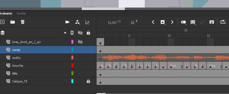 Dans le cadre d'une animation simple de personnage avec lips inc, j'ai 4 calques : un avec la tête convertie en symbole graphique, l'autre avec la bouche convertie en symbole graphique également, un avec le corps et le dernier avec l'audio.