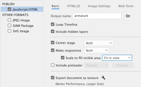 Try not to use Static Text where ever that is possible. Only for purposes of precise placing (e.g. "Start Here" on a start touch/button) Static makes sense. Otherwise use Dynamic Textfields in combination with web fonts, either Adobe or Google fonts. If you use Static text and Export document as texture is off, all static text is converted to shapes and coded into the export JS file. If Export as texture is on static textfile will be rasterized and added to your spritesheets. However learn more about web fonts Using Google Fonts and Working with Adobe Fonts.