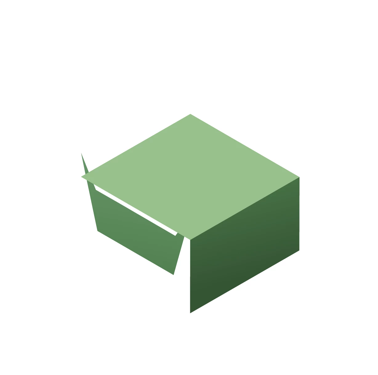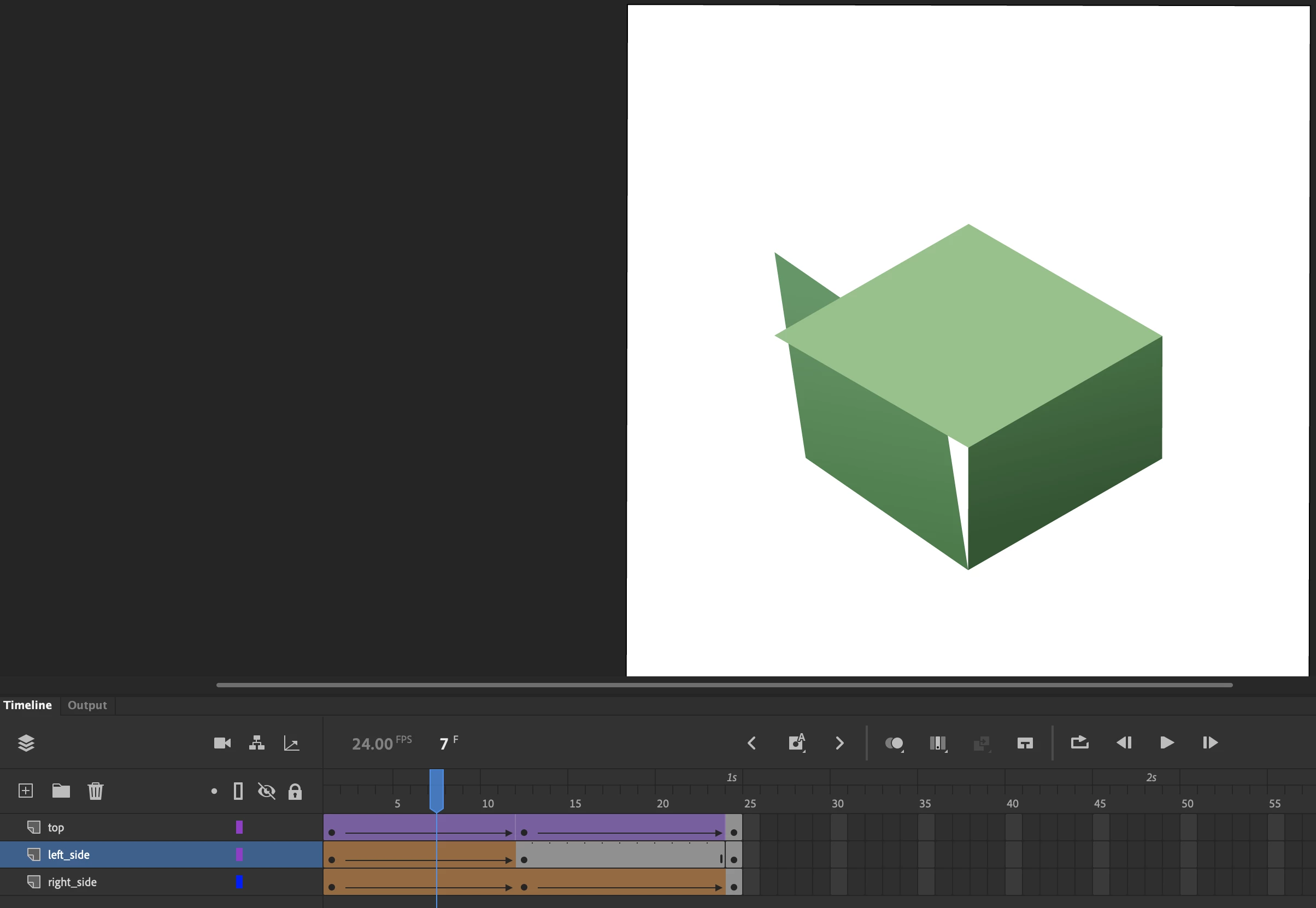 I've set up my file with each polygon on its own layer. Animating the 'top' up and down is easy enough with a classic tween, but I'm unable to consistently deploy the shape tween for the left and right 'sides.'
