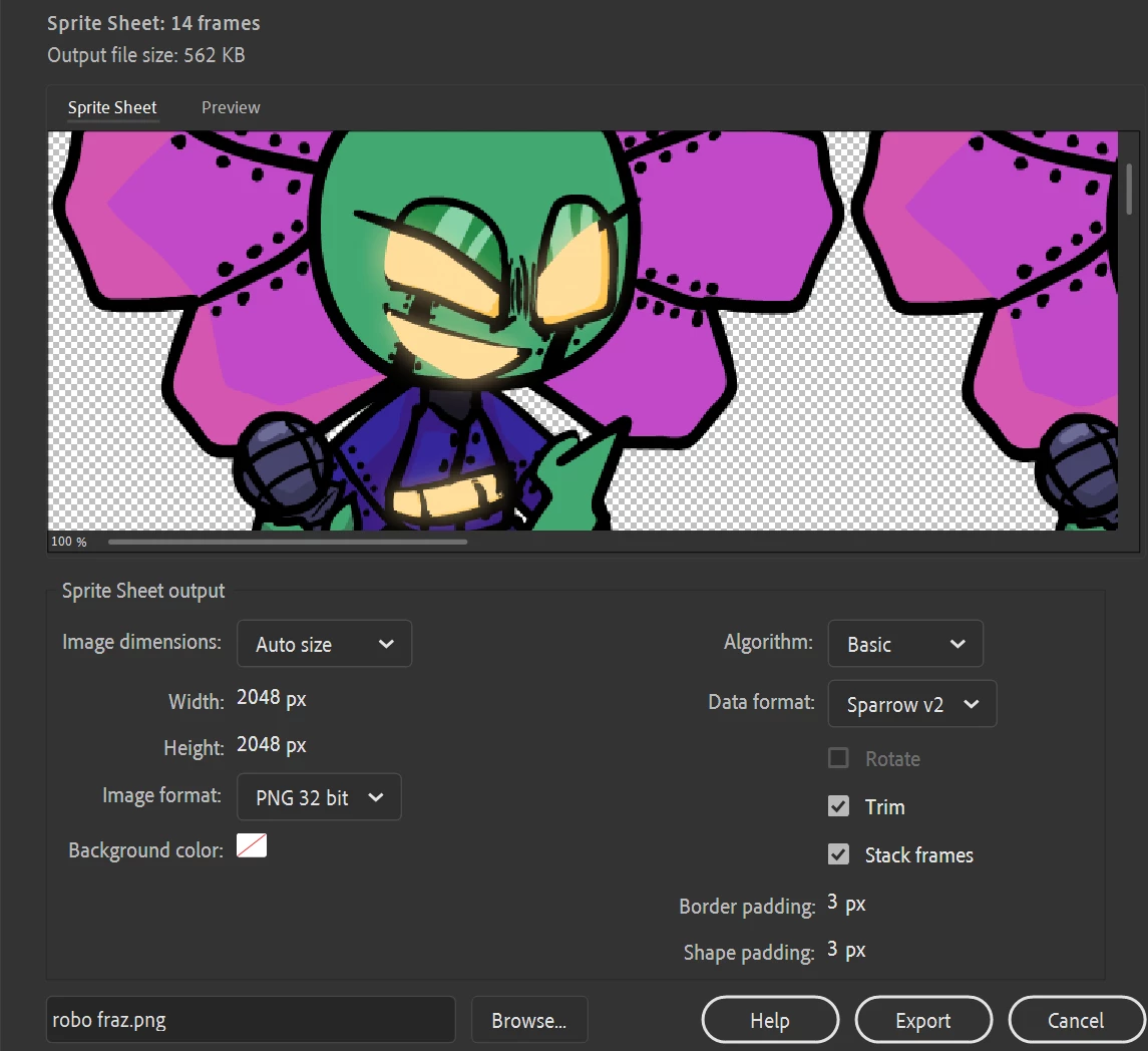 So i've been working on this for a day. And I am trying to export the sprite sheet. However
