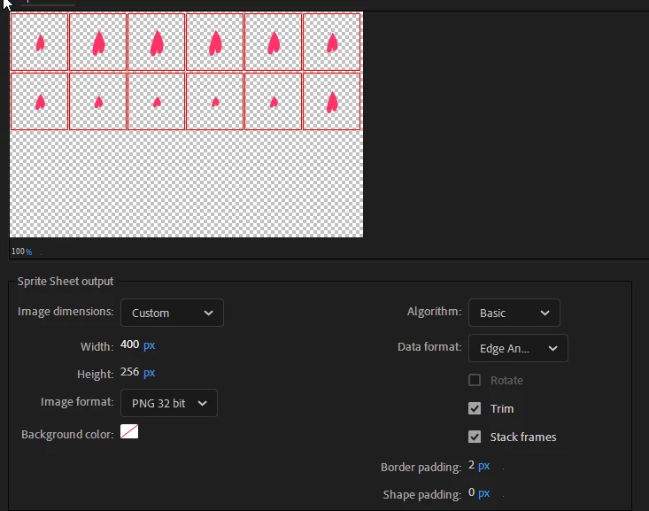However, the sprite pivot / anchor looks off. The grid is asymmetrical. Which makes it unreadable in any other program so far as I know. It looks like it is trying to account for the cropping fromthe top left. I thought this might be due to the movieclip's anchor registration but I can confirm it is set to the center. And the animation is also center stage.