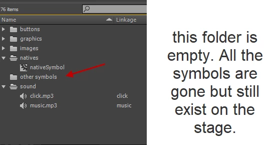 I created a symbol folder (other symbols) in the library and moved most of my symbols there. For some reason all the symbols are gone though they still exist on the stage. How can I get them back in the library?