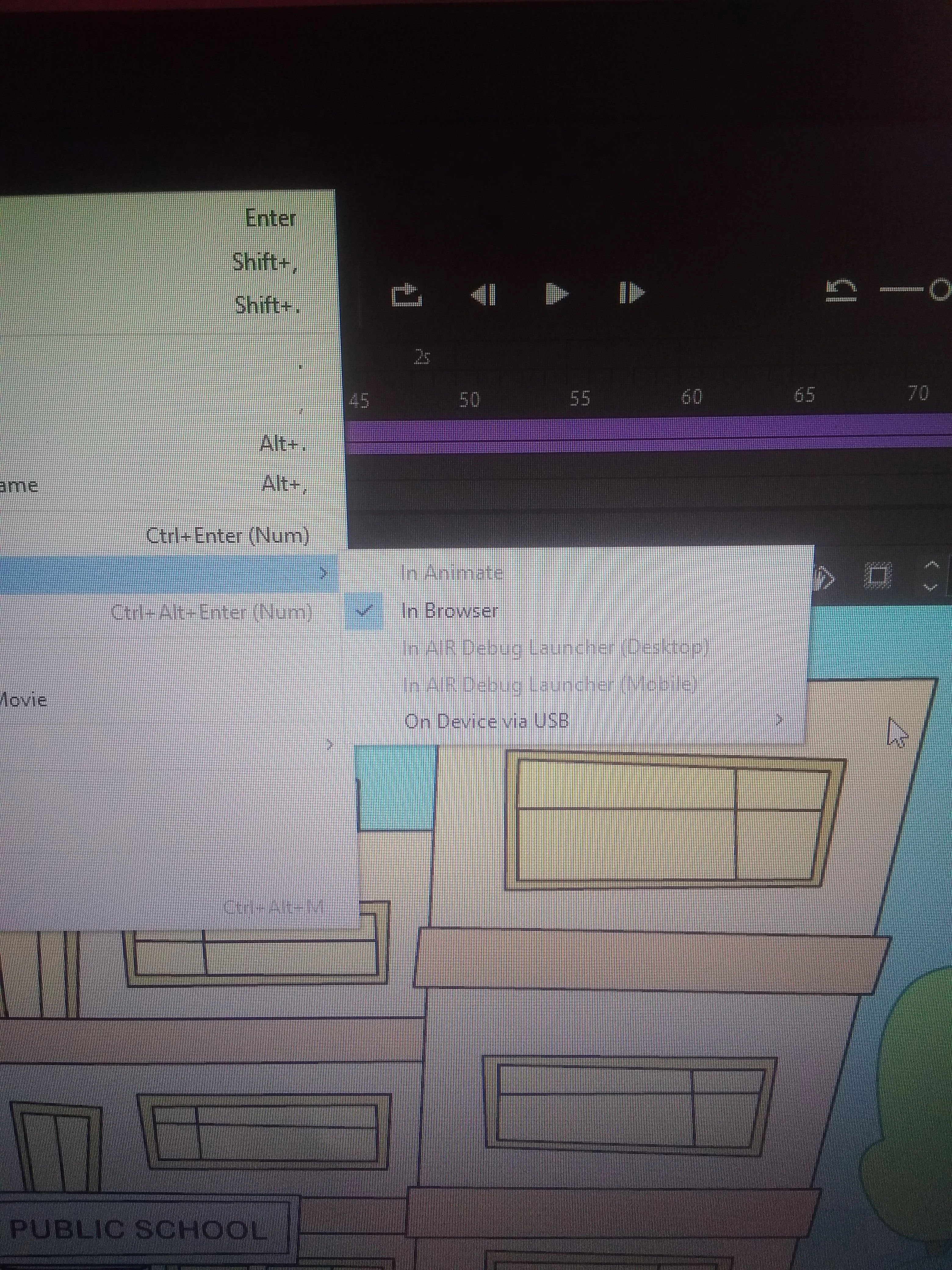 I am new to Animate, but I have worked regularly with the older Flash-Versions. I am missing the "Test"-Function, where I can also see what I was tracing in my scripts via "trace("whatever")". However, I am only able to test my movieclip in the browser, all other options are grey.