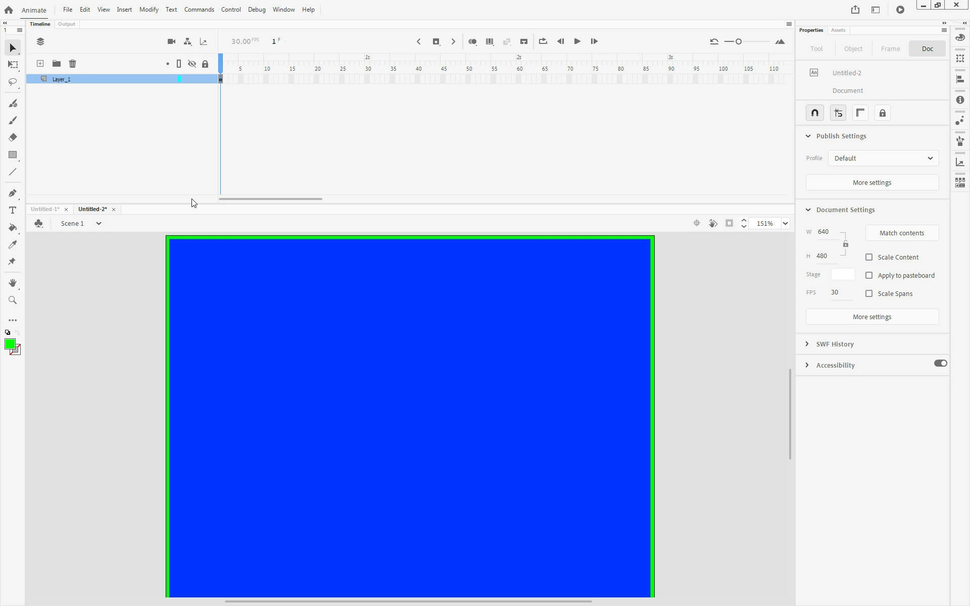 This first problem has persisted for as long as I can remember. When you select Ctrl+2 (View | Magnification | Show Frame), the app does *not* show the full frame. The bottom of the frame is cut off. Just a bit, about the height of the (often unnecessary) horizontal scroll bar. In the attached screen shot, I’ve created a blue box with a green outline, the same size as the document. You can see that Show Frame has chopped off the outline at the bottom.
