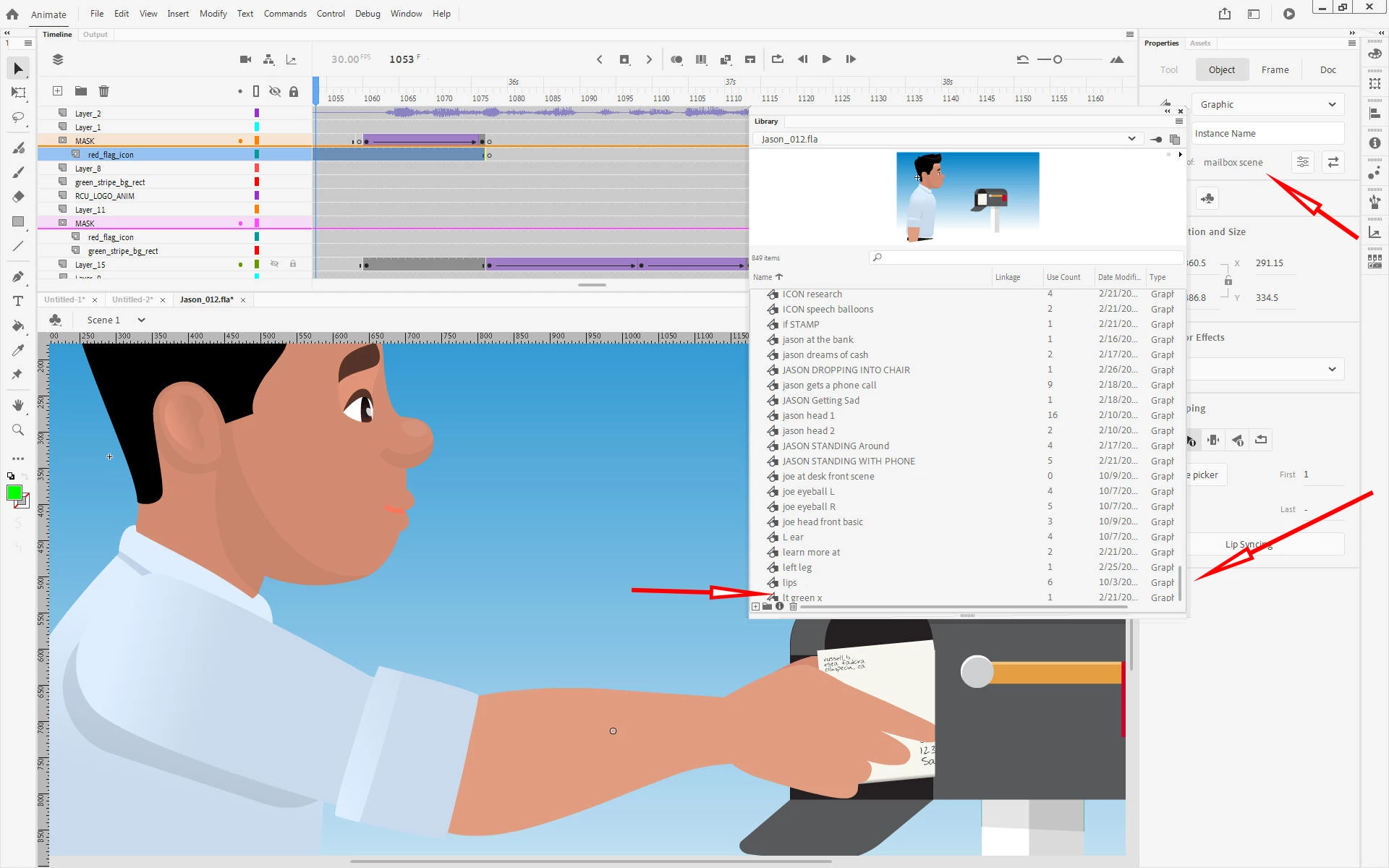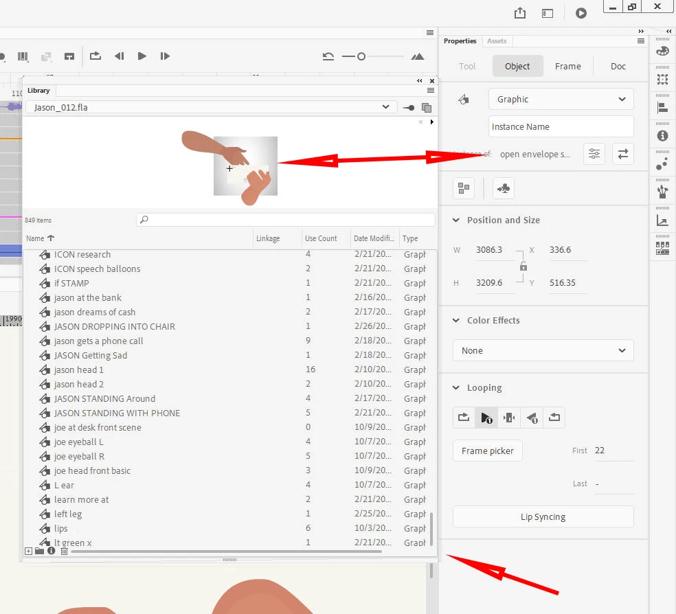 For example, here I’ve selected the Graphic, “mailbox scene,” and chosen Show In Library. You can see that the thumbnail at the top of the library pane is correct; that’s the “mailbox scene.” You’ll also notice that “mailbox scene” doesn’t appear in the list of library objects. That list seems to stop at “lt green x.” It doesn’t continue into the m’s, even though we know at least one item, “mailbox scene,” is down there.
