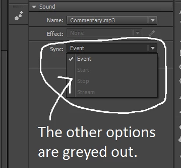 After doing some searching on the Internet, I figured out I have to switch my audio sync setting to Stream so that I can play audio anywhere in the timeline. However, the only option I have available is Event. The other ones are greyed out, as the screenshots below testify. Any help would be appreciated. Thanks!