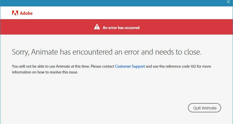 i am unable to use Adobe animate it is saying that Sorry animate has encounteed an error and needs to close. The reference of the error code is given 102. Please can anyone help me regarding this of how can i use animating without having errors.