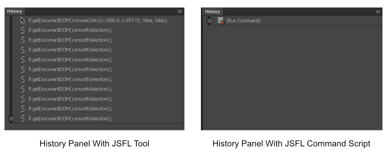 For example, the following JSFL tool script allows a user to click on a shape and smooth it by running Animate's smoothSelection() method several times.