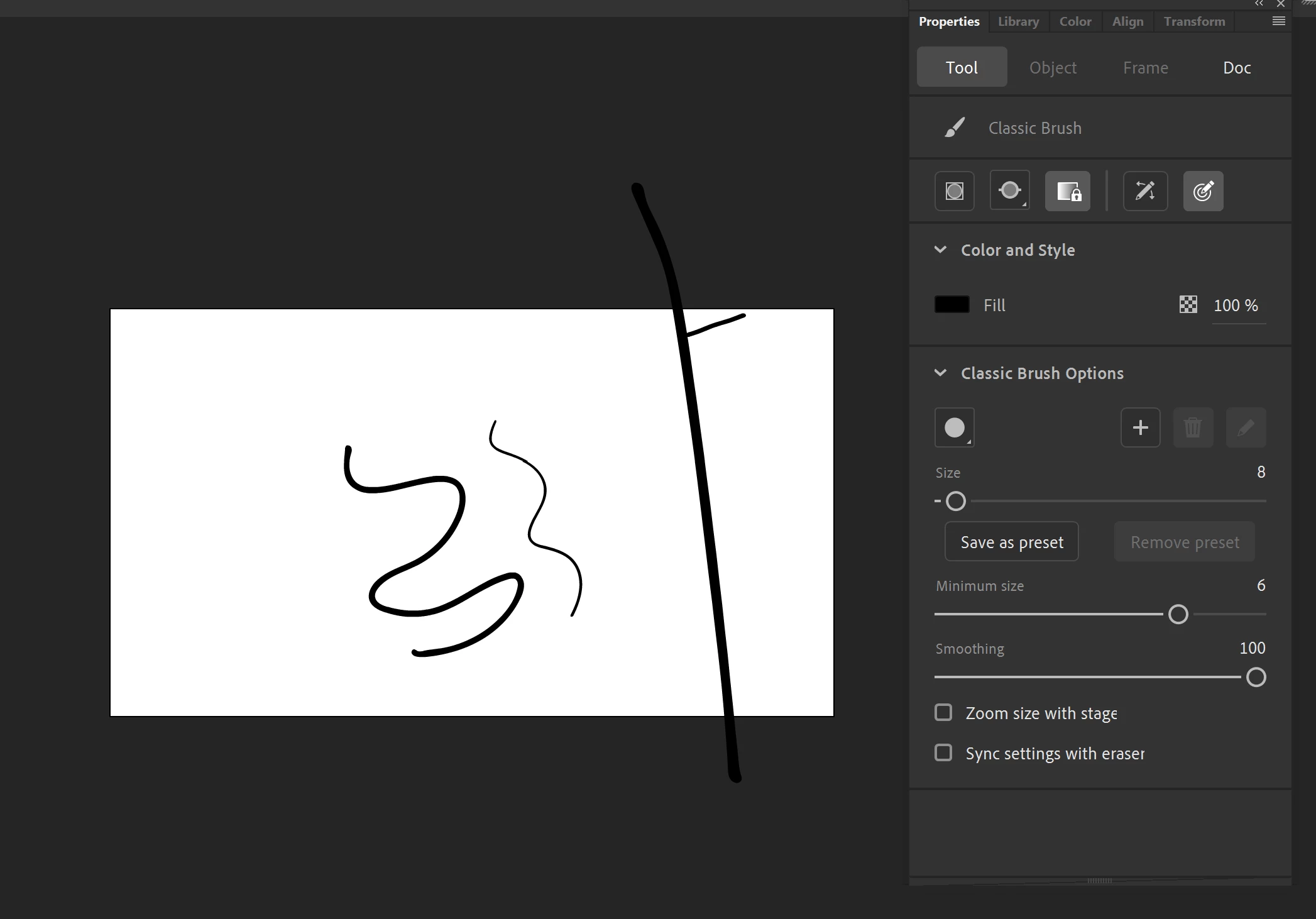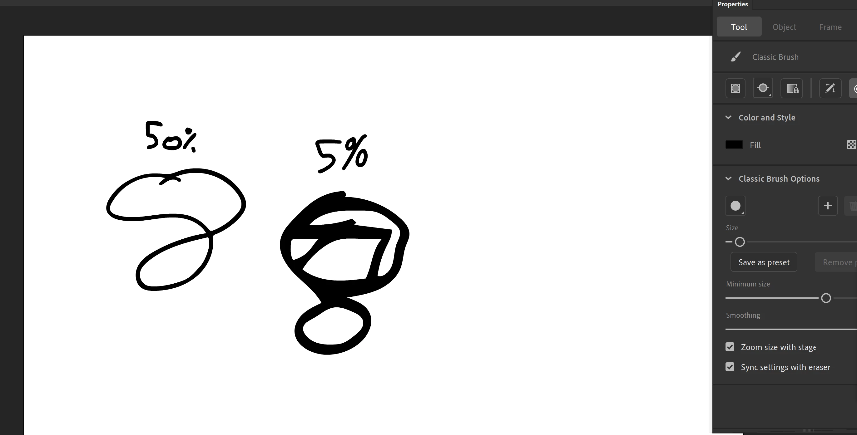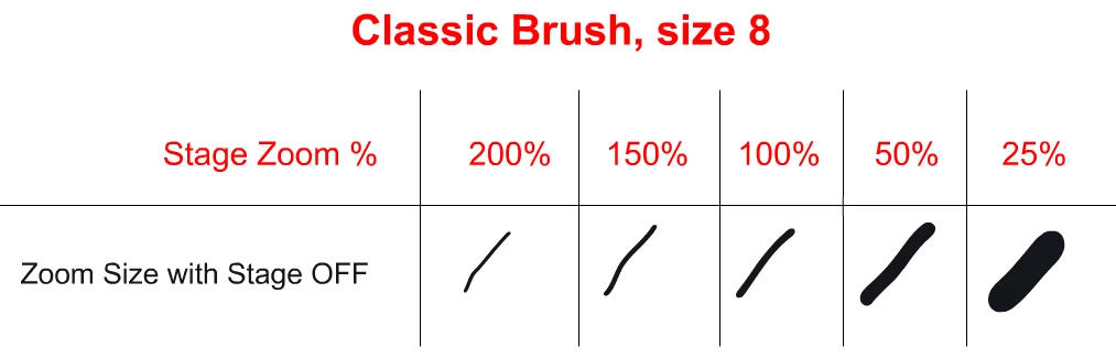 I've used animate for more than a year now, and suddenly, my brush started to zoom it's size with stage, no matter if the option is on or off. I have it turned off right now and it still changes the size even if it's deactivated, I took a screenshot, all of the lines are drawn size 8 pix and min 6, zoom with stage option deactivated, and the only thing I changed is the % of zoom on the stage, it's very annoying and right now I have to finish a project before a very tight deadline, help please!