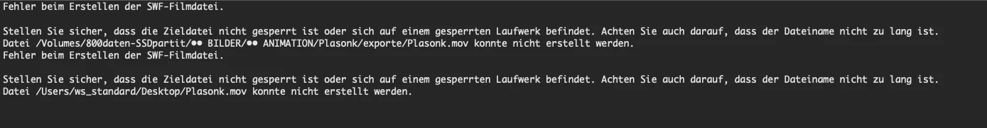 ich möchte eine in ANIMATE erstellte animation als video exportieren. via "Video/Medien exportieren" erhalte ich den 1. alert "Fehler beim Erstellen der SWF-Filmdatei. Stellen sie sicher, dass die Zieldatei nicht gesperrt oder auf gesperrten Laufwerk befindet …", danach 2.alert "…xyz.mov konnte nicht erstellt werden".