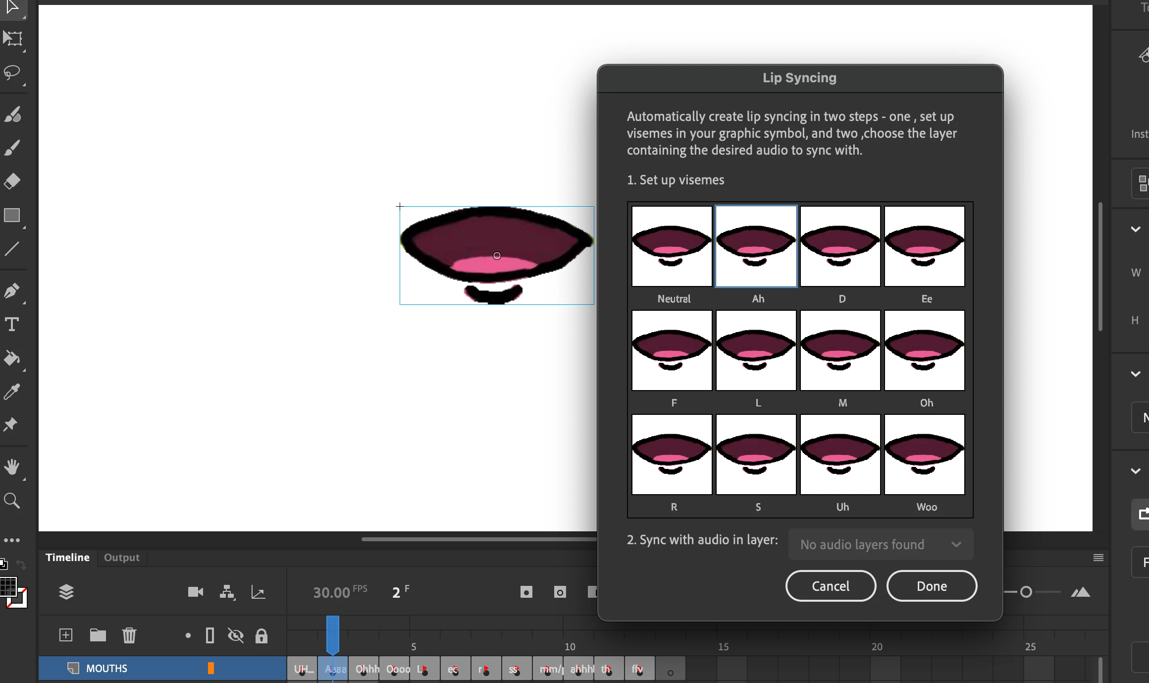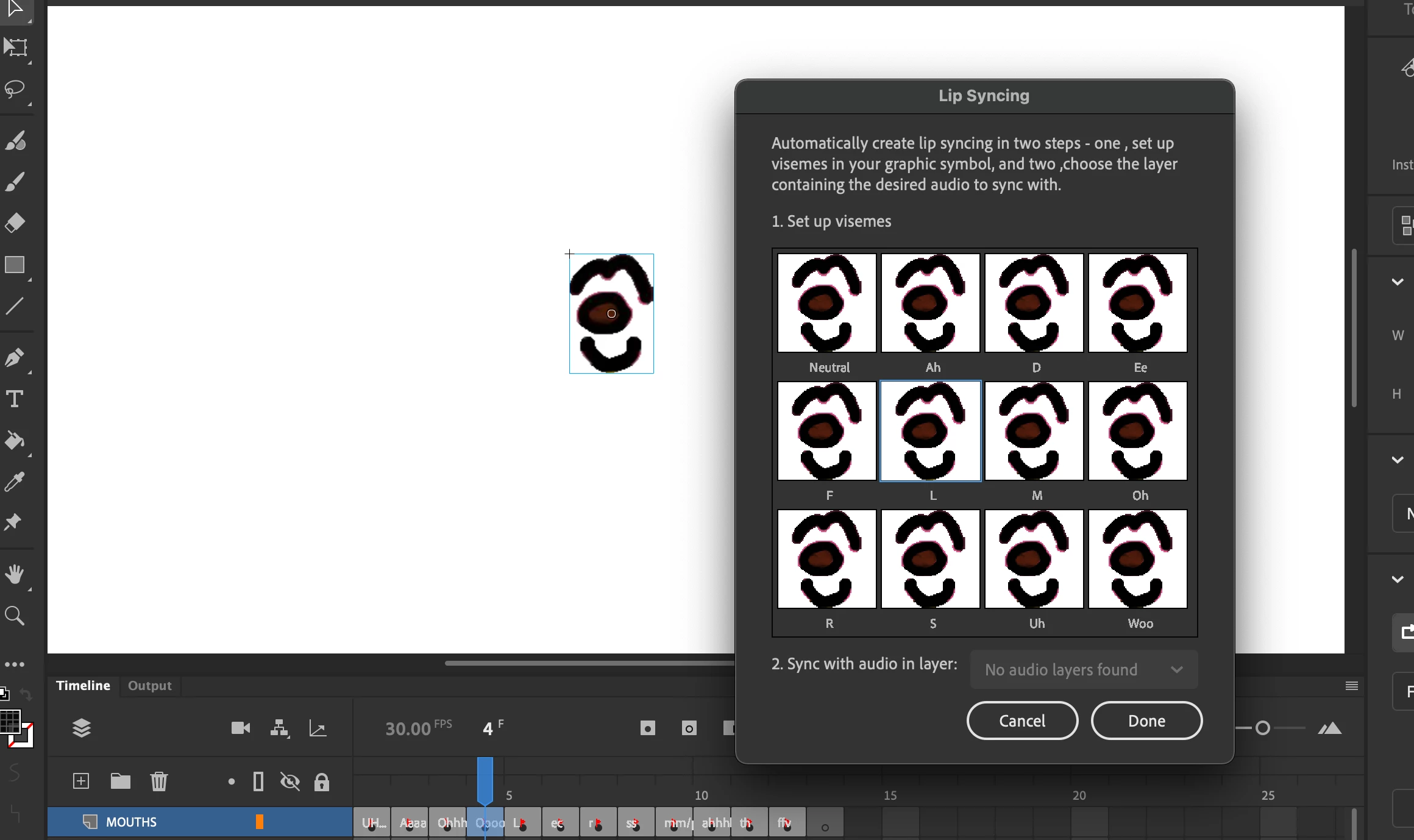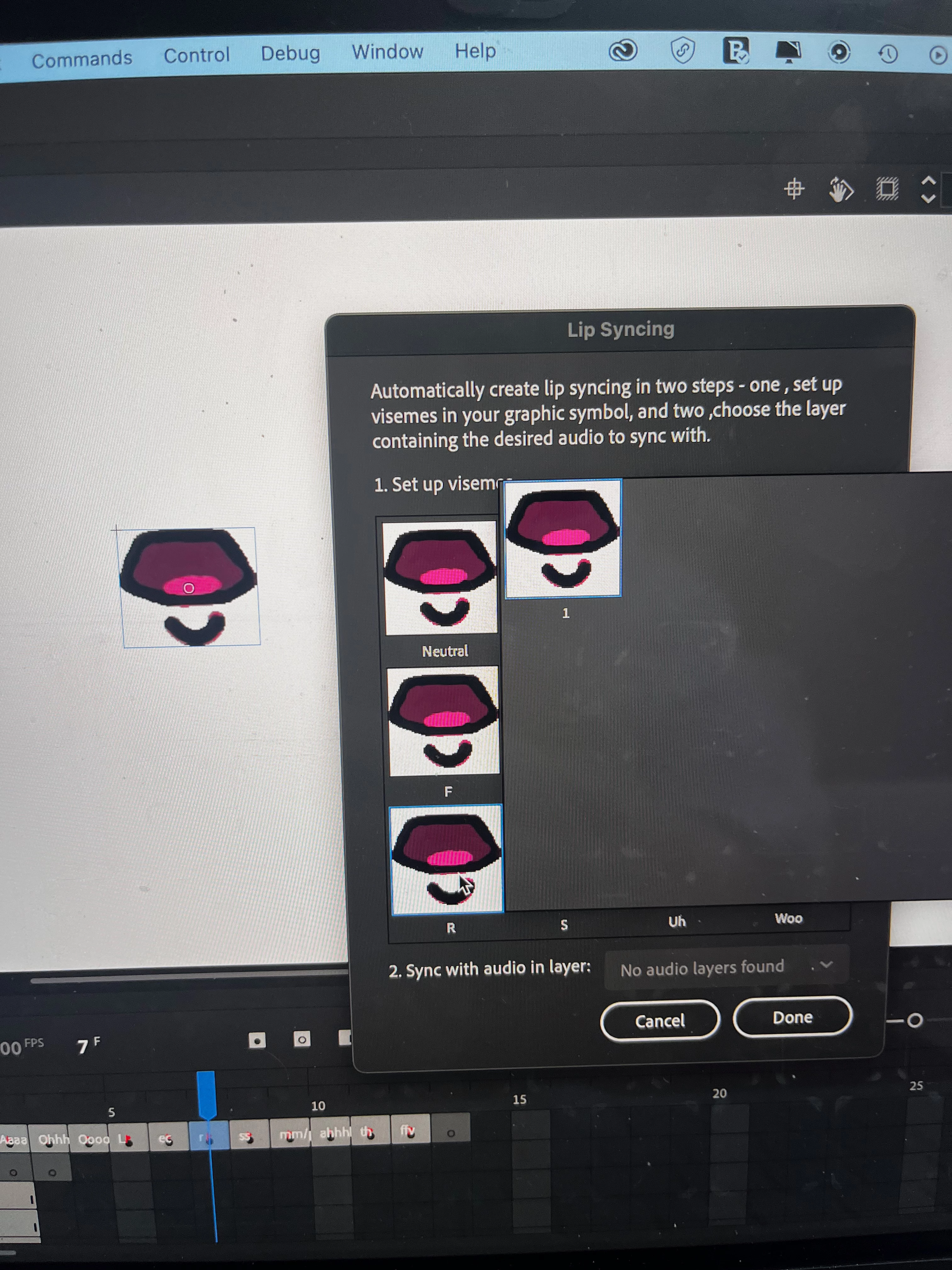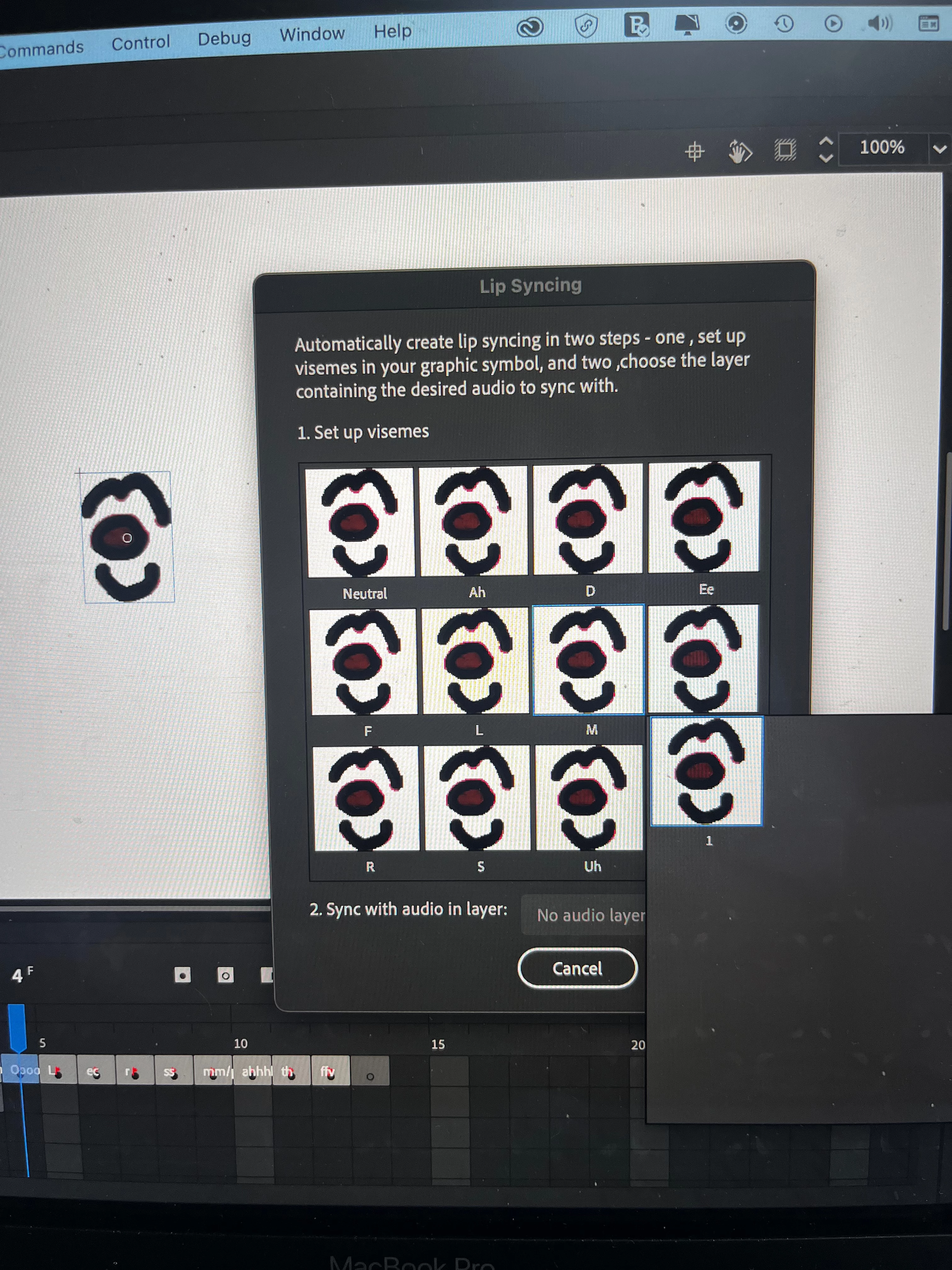 I am trying to set up my visemes. They are all set up in each key frame and as a graphic symbol. However when I go to select the right mouth for the sound made it only shows the current frame that I am on.