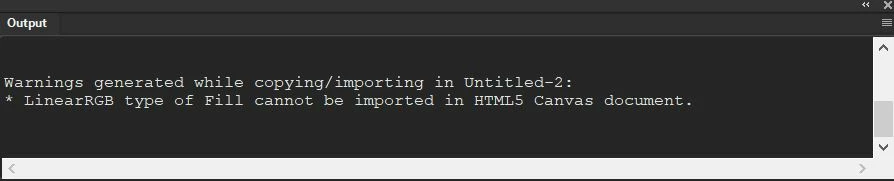 Warnings generated while copying/importing in Untitled-2: * LinearRGB type of Fill cannot be imported in HTML5 Canvas document.