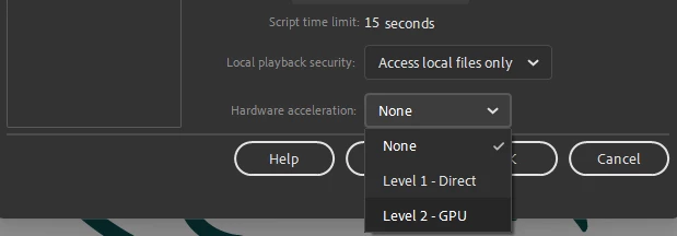 When you open the publish settings, you will see the hardware acceleration option. The default is "None". There are two more options in the drop-down list, "Direct" and "GPU". Can anyone explain what this means? Will checking different options improve the smooth performance of the current document? This is confusing.