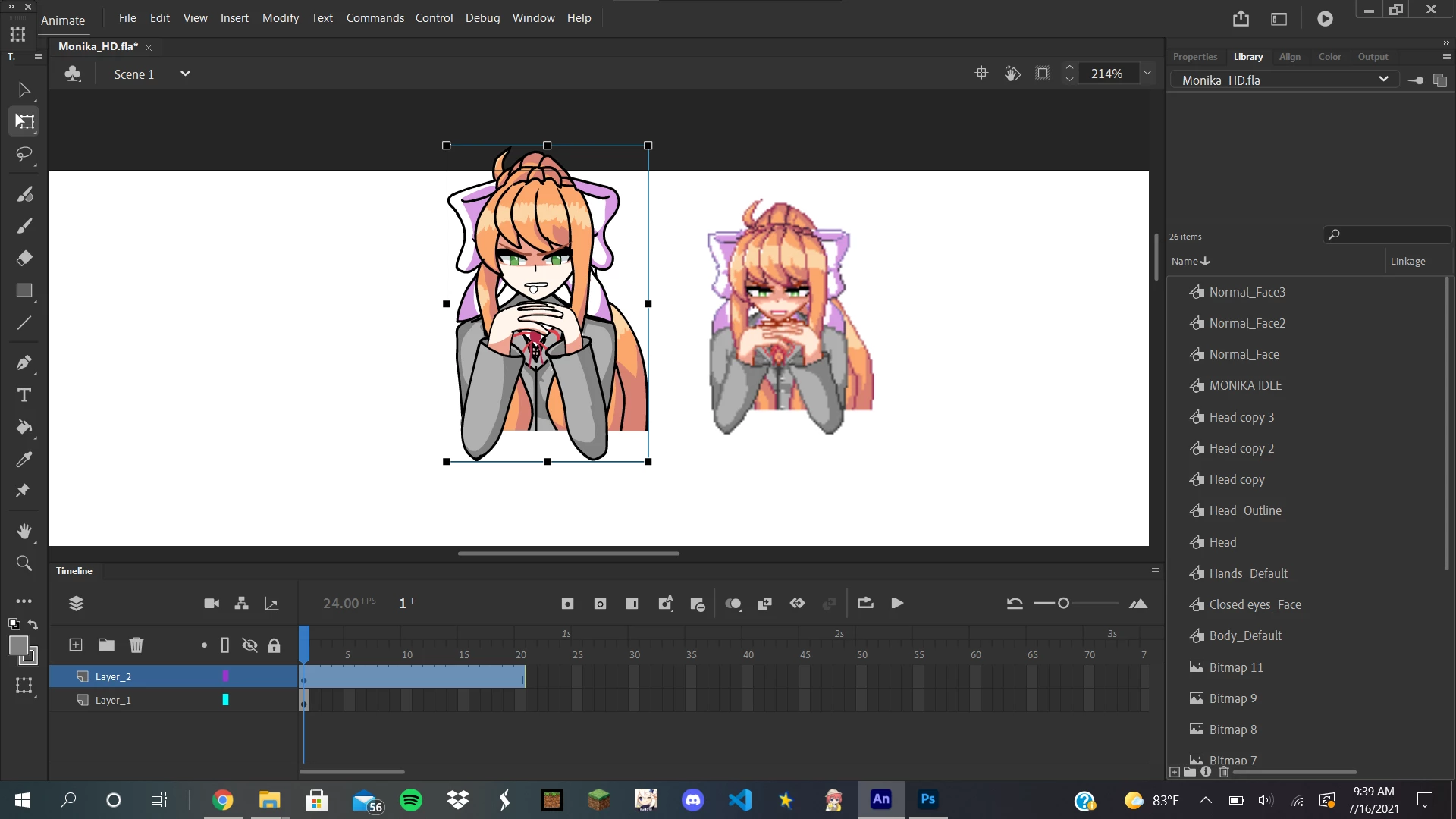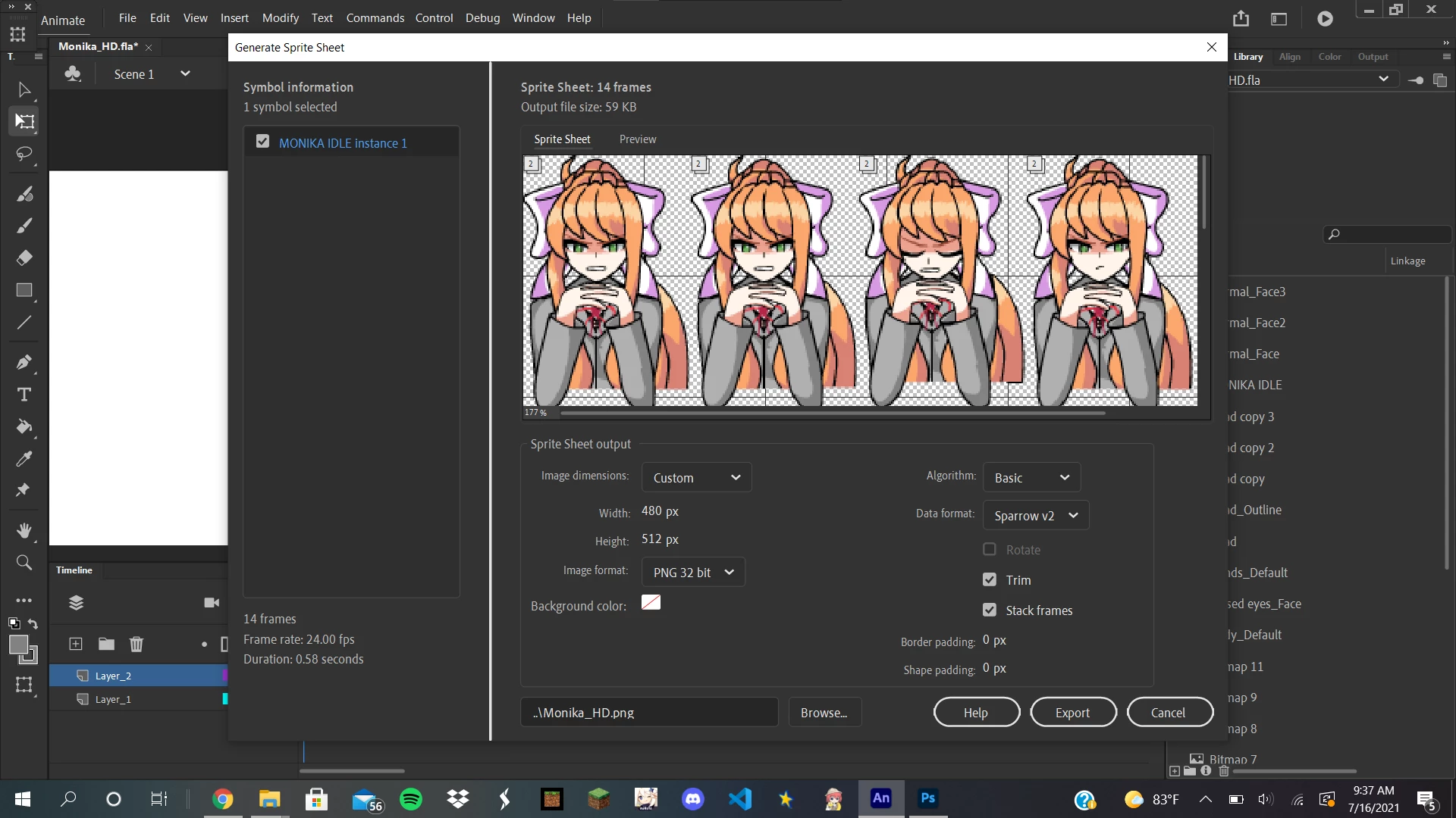 Double click the symbol containing the PNGs then select all frames using the Edit Multiple Frames button above the timeline (or press Alt+Shift+E on your keyboard), now scale up the drawings a little with the free transform tool (Q) and try generating the spritesheet again.