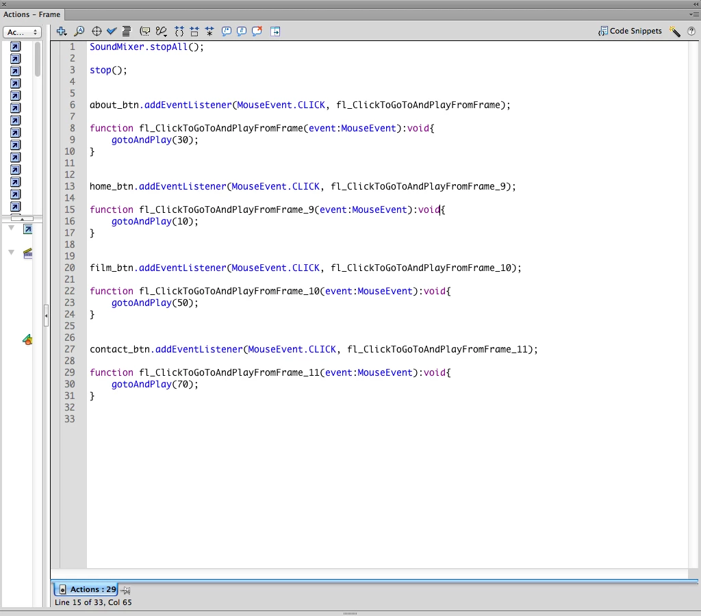 I've used code snippets (Click to Go to Frame and Play) for each button.