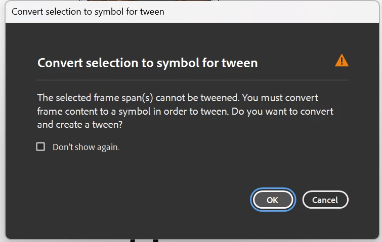2. The dialog you’re seeing suggests that the layer contains more than one element. In order to create a tween, each element must be placed on its own separate layer.