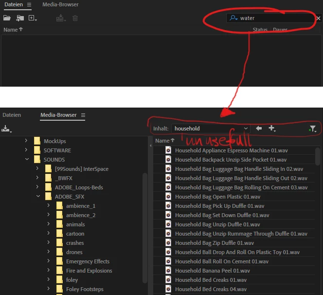 Add a serchbar to the media browser... in the files you have a search bar which is unnessecary because finding the sound on the timeline and copy it is much easier ... but in the filebrowser where a searchbar would be helpfull it completely missing... that makes finding sound in a soundlibrary that has 10k or more files in it a hassle.