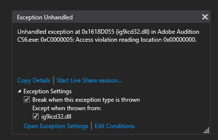 Unhandled exception at 0x1618D055 (ig9icd32.dll) in Adobe Audition CS6.exe: 0xC0000005: Access violation reading location 0x00000000.