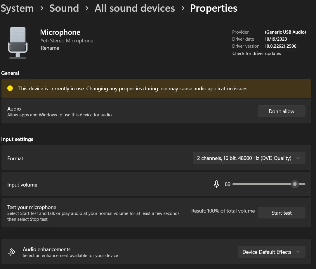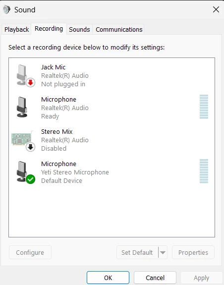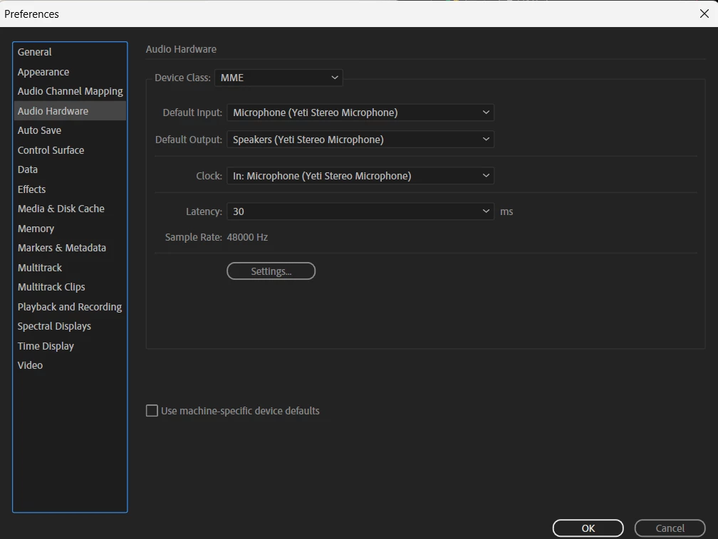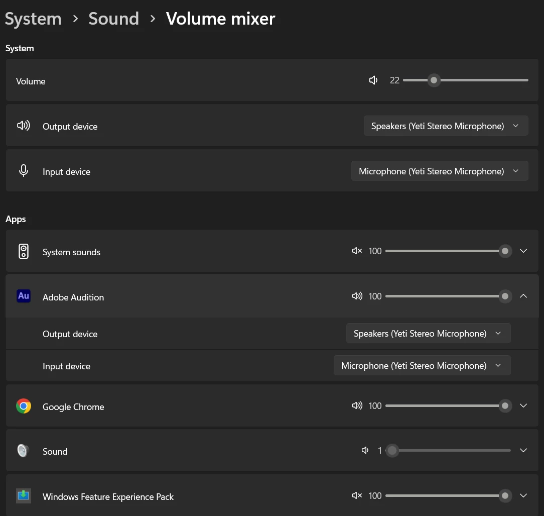 Made sure that Audition has the Yeti set for the Audio Hardware