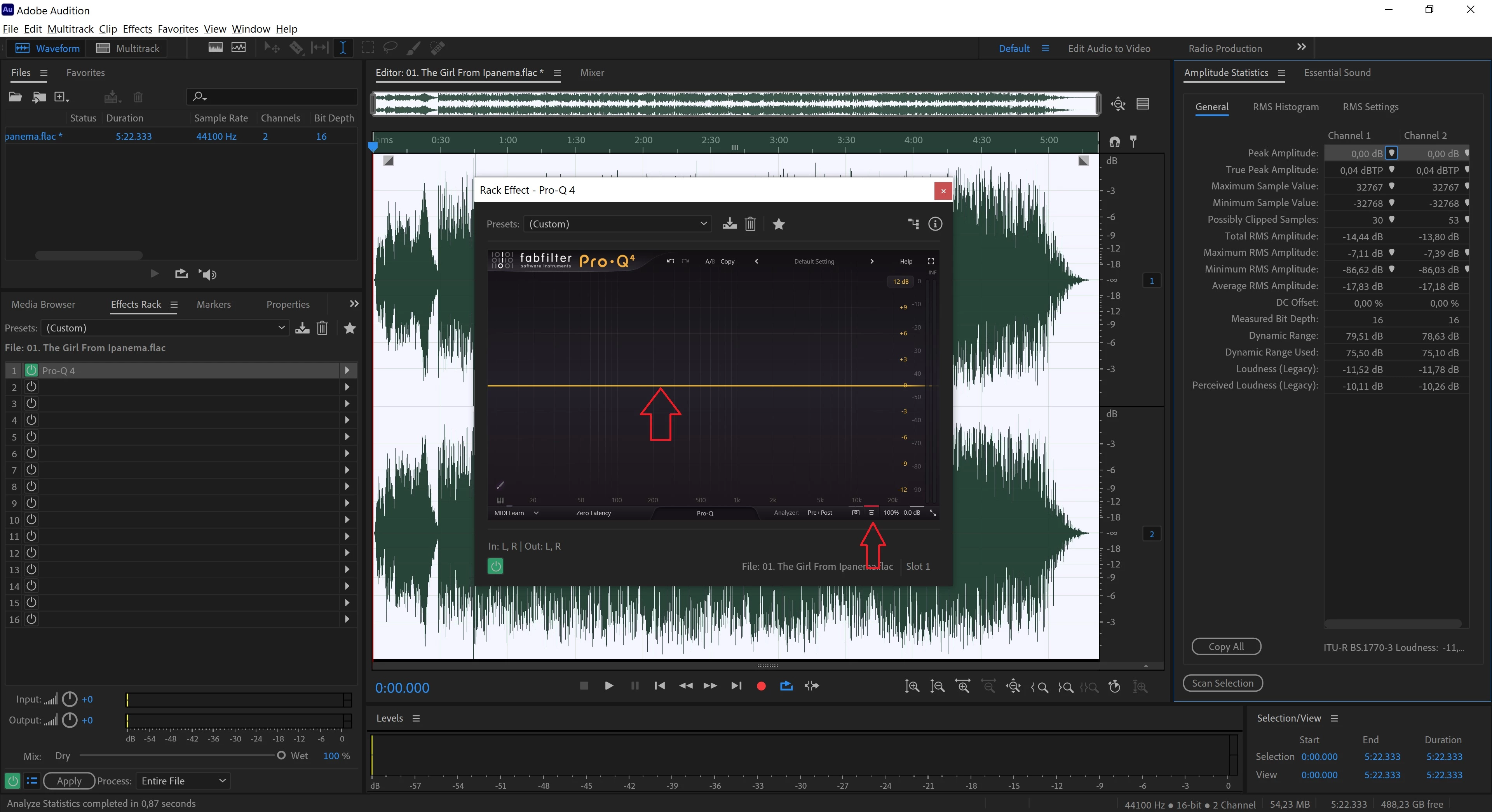 For the experiment, I upload only one VST3 plug-in to the Effect Rack (FabFilter Pro-Q 4 (flat default)), enable bypass mode on this plug-in, click Apply, and save it in the same format. The result: more than 5% of the information is lost. The source file is 36.1 MB, and the saved file is 34.2 MB. On large 24-bit files, up to 20% of the information is lost!
