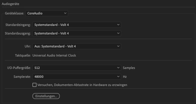 I checked the audio settings which says "Volt 4" for I/O and the clock, I tried to change the buffer size: nothing helped. - What can I do? I'm glad for any advice. (I'm using a Macbook Pro M2, running OS ventura)