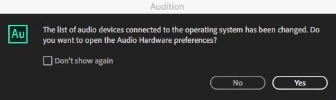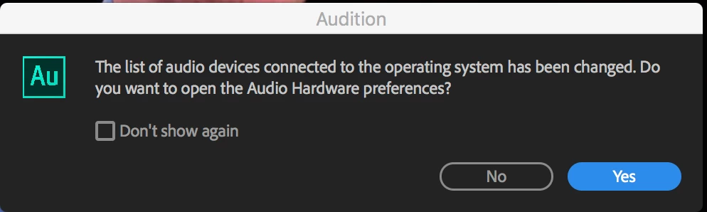 Well, firstly it's Core Audio, connected to external monitor through thunderbolt. No, the picture stays on perfectly all the time, it's just Audition "losing" something... It's set to use "system default" – this doesn't change.