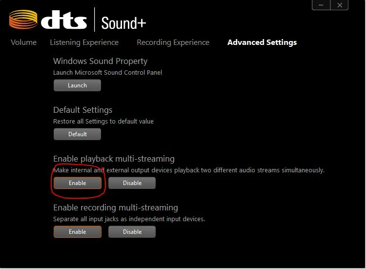 It has a sound panel from "Nahimic" (I guess for gaming purposes), a MSI branded Realtec panel, NVIDIA (which I do not see a control panel for audio) and the Windows panel.  I enabled the multi-streaming ain the Windows sound panel and it's still sending the error.