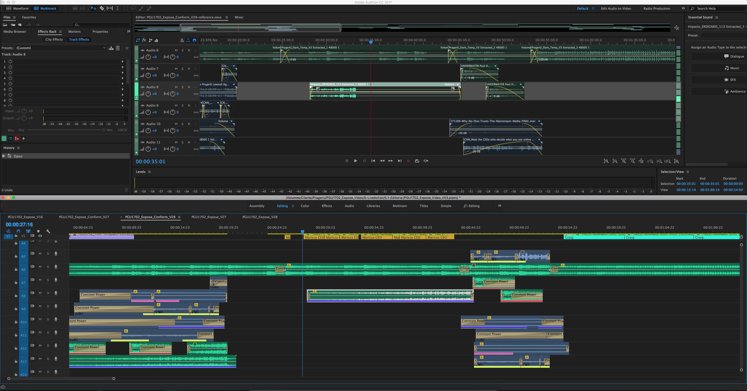So when I export a sequence from Premiere to Audition, the Speed/Rate of audio clips gets ignored (see above how the audio clip selected is the proper length in Audition, but the sound waves aren't stretched as they are in Premiere below). Only workaround I've found is to Render and Replace all stretched audio in Premiere before exporting. Has anyone else run into this issue or found any workarounds? I'm used to exporting audio with handles for my audio tech which is why I'm asking. Thanks!