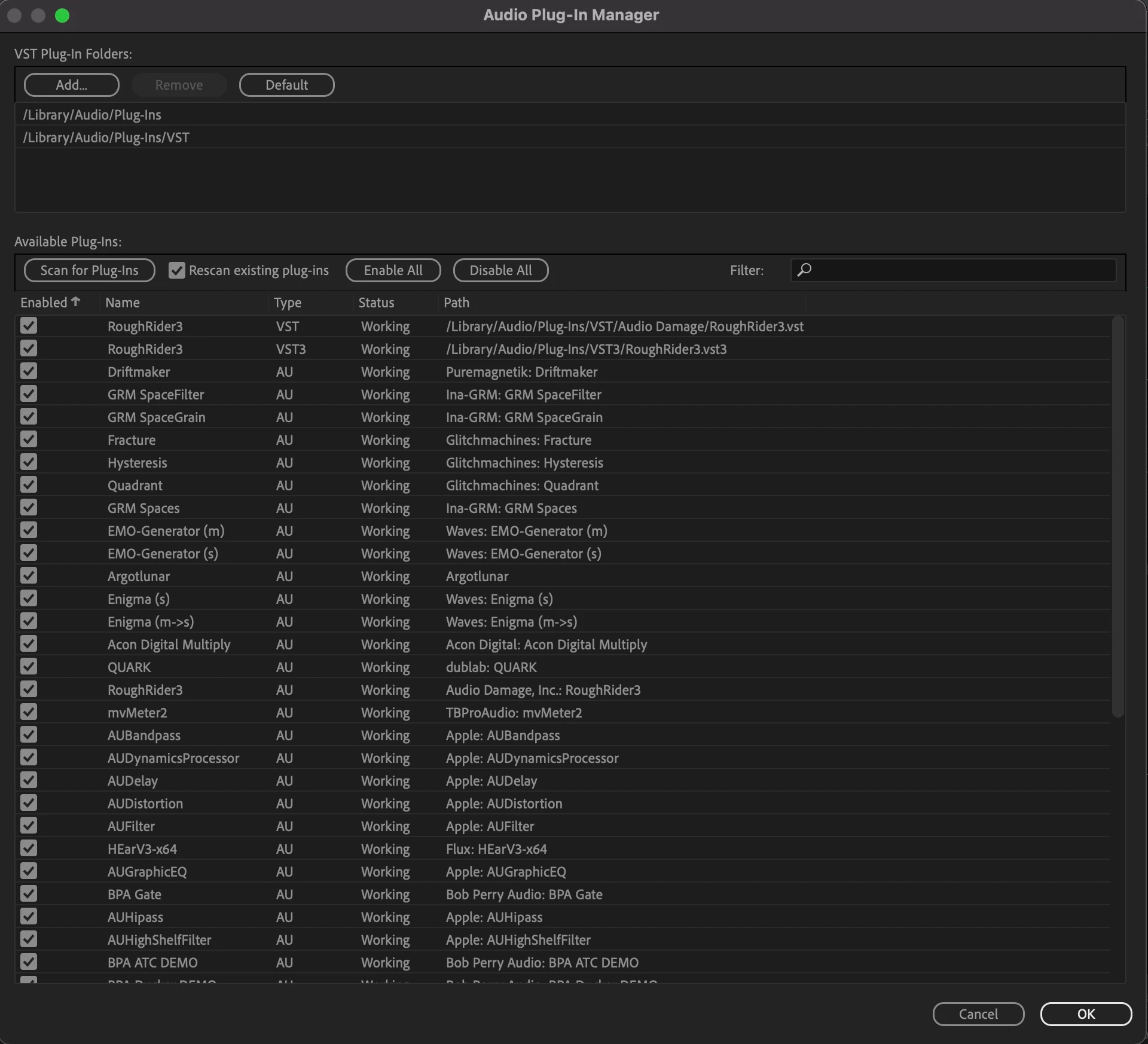 I have a large number of VST and VST3 plug ins and since my recent Audition upgrades they are no longer loading in my effects. I have tried rescanning, removing the search folders in Audio Plug in manager, but to no avail!