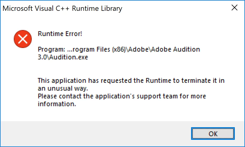 Hello, I have a problem with my audition 3.0, I install it in my new PC (Dell Inspiron 15 5000 series ) with windows 10 and i keep getting a Microsoft  visual C++ Runtime library error. I have installed all Visual C++  Redistributable. Uninstall and install again. but haven't manage to fix it. It doesn't create the setting folder in the AppData folder so i can try the method of deleting or renaming the folder. I installed it in a friends computer with windows 10 and it seems to be working fine there.