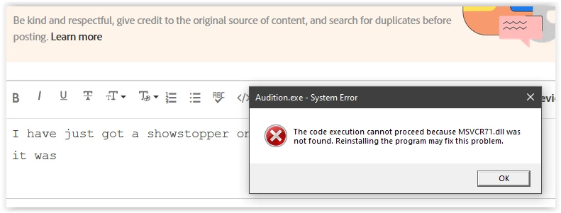I have just had a very similar showstopping System error from trying to launch it it was asking for MSVCP71.dll    //  My copy of Adobe Audition 3 is now totally unuseable!!! I bought your Audition cd package years ago & I still need it!! Am I going to get some replacement?