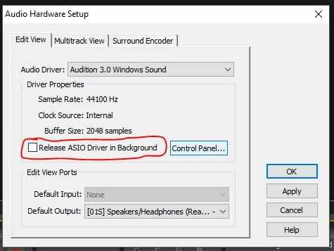 If Audition 3.0 is playing and I open my email or anything else...Audition stops playing...How can i set it to continue playback evein if i'm in another window...I'm using windows 10...i unchecked the ASIO Driver abd it still stops playing...