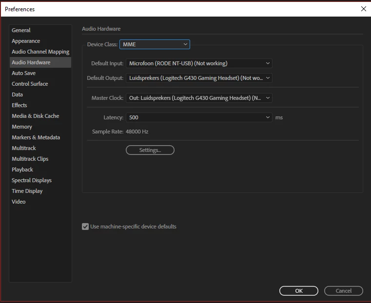 Audition CC MME device internal error