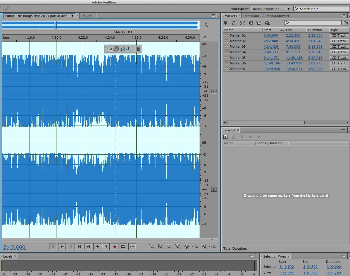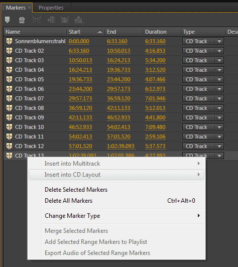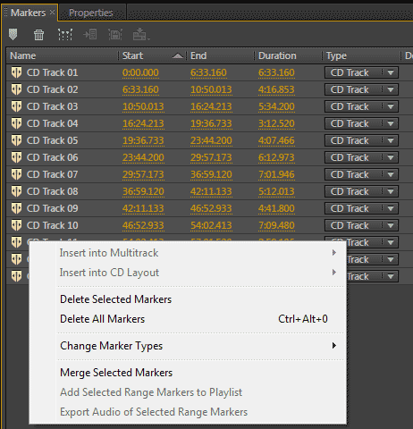 Now, with Audition CS6 I'm able to put in the CD track markers, and can even see them in the markers list as CD track markers, but when I go to the CD Editor view only the entire audio file appears. So I was wondering how I get the markers to appear in the CD Editor view in the same way they would show up in the CD view in Audition 3. I'm hoping someone has an answer to this as I haven't been able to find anything about it in the help files or on these forums. Thanks.
