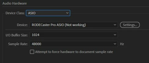 I'm not entirely sure what triggers it, but after I've been working with multitrack sessions using the RODEcaster, an Audition error message will pop us saying that my audio hardware (RODECaster ASIO) has failed to load. It then prompts me to reset the "Audio Hardware" preferences. I initially thought it was only when the computer went to sleep, but my current computer is set to never sleep and yet I still got this error message.