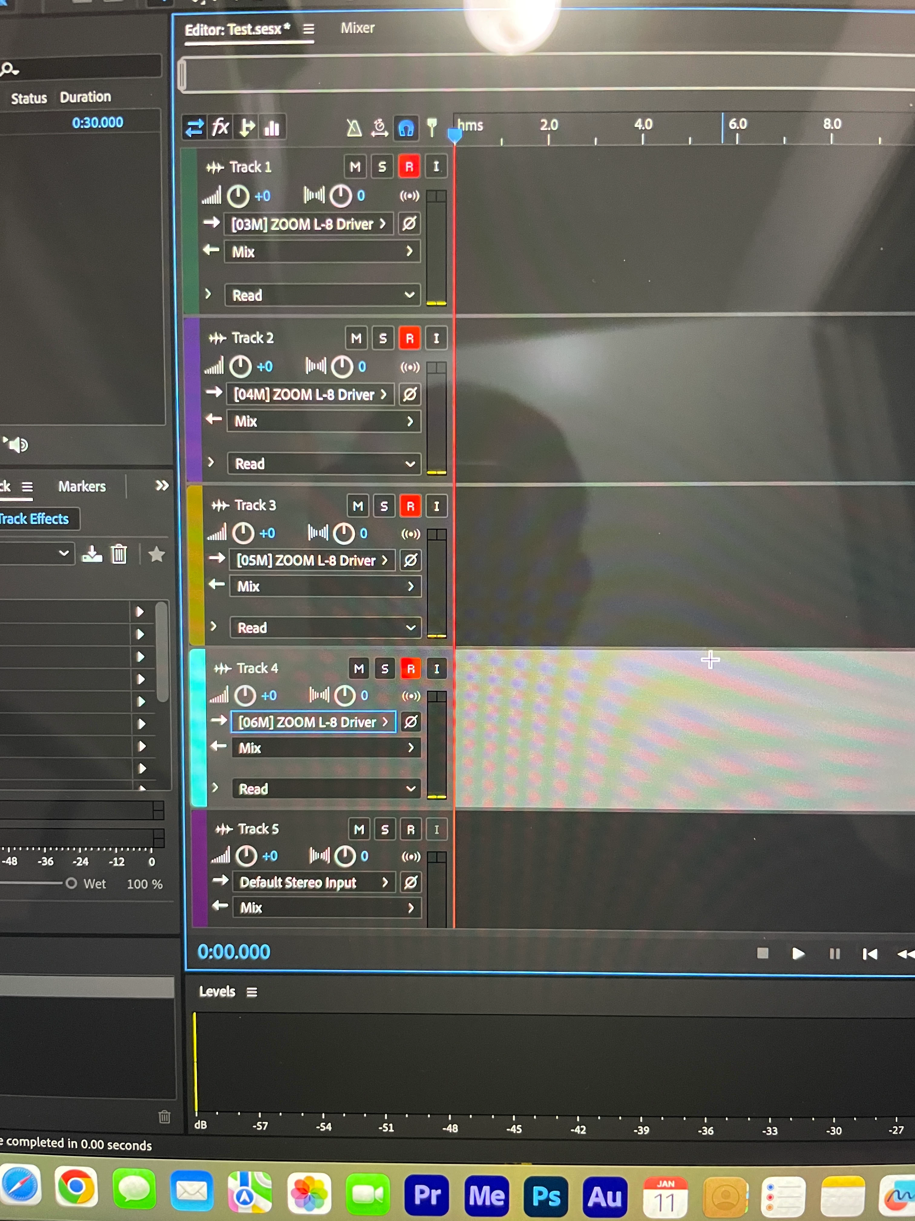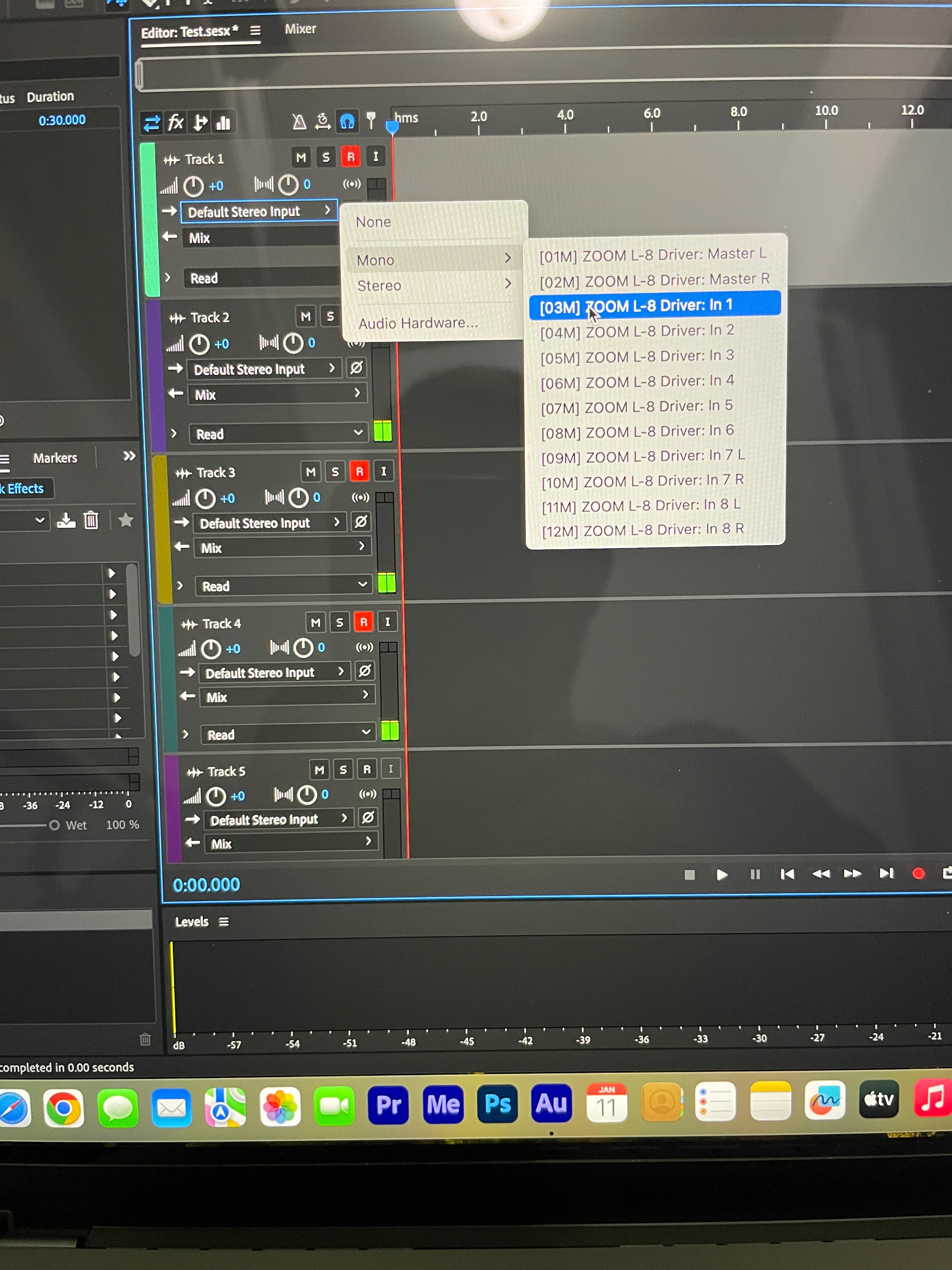 I'm using the Zoom LiveTrak L-8 with Audition on a new MacBook Pro. The driver is fully installed and the device class is CoreAudio (only option).