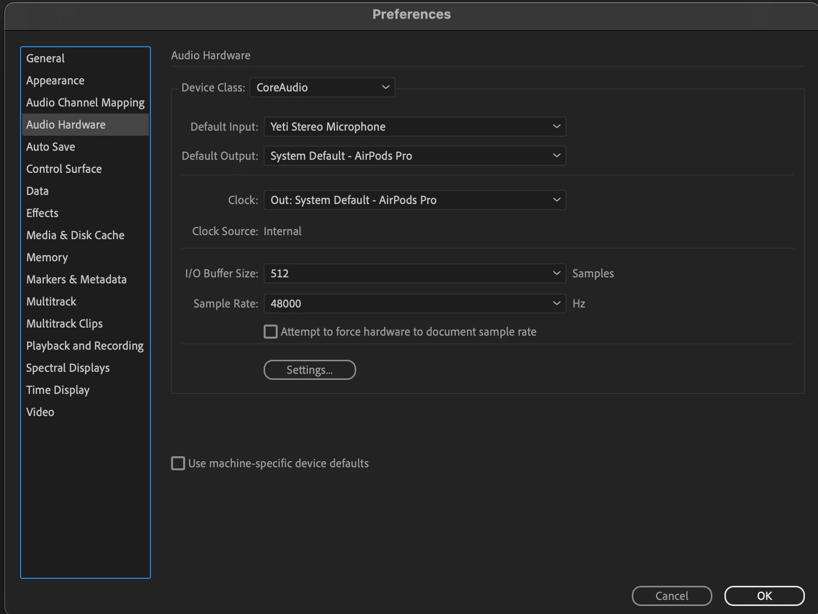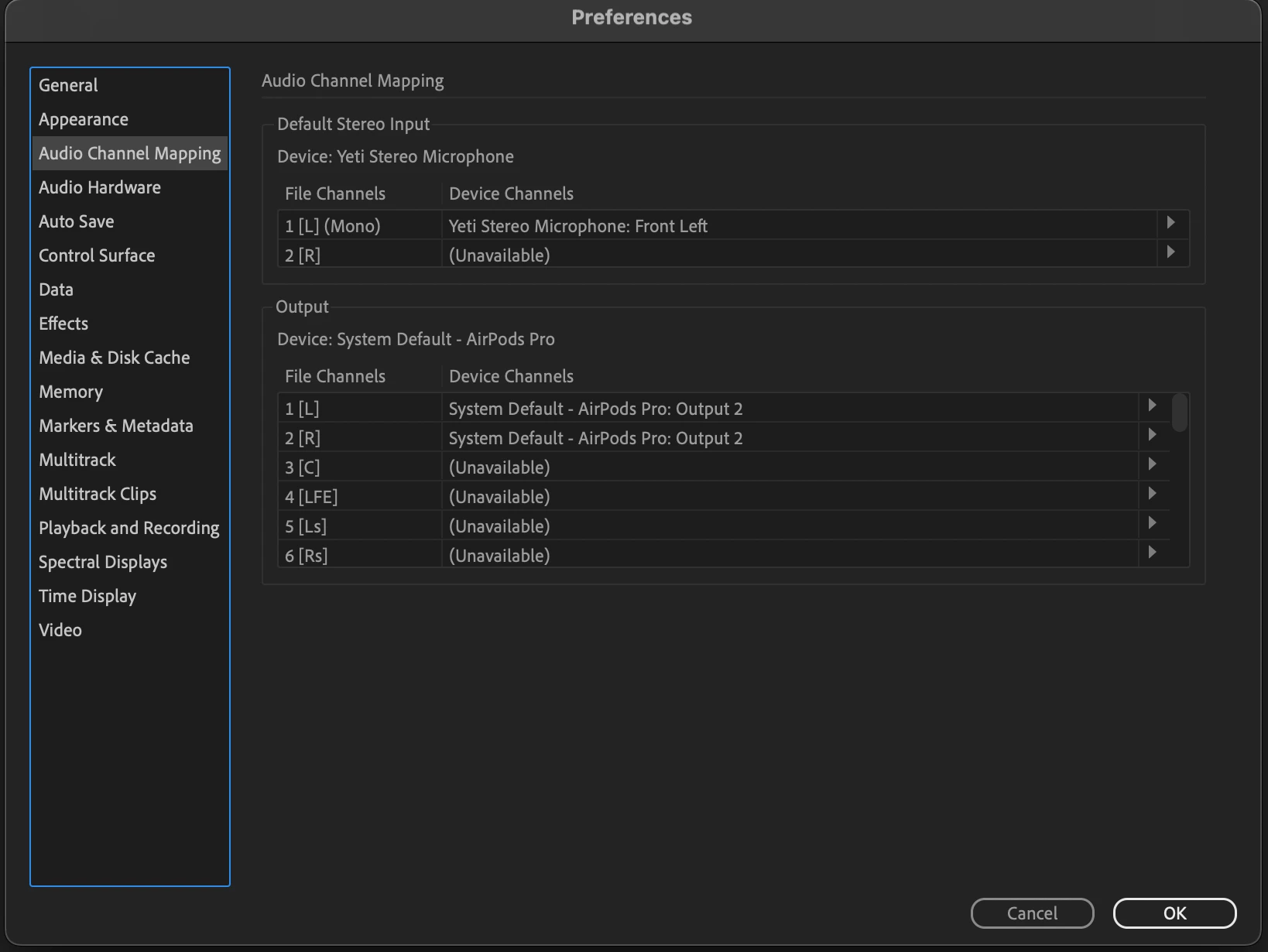 I am using Audition version 25.3, with a Mac Studio and a Yeti Blue stereo mic. I am trying to record a voice-over for a short video. I've tried recording in mono and stereo, but either way, it only plays back in one ear or speaker. I've checked hardware mapping (last setting attached), and checked hardware config (attached). I've converted to mono and dropped to the left channel. I've recorded it in mono and tried to convert it to stereo, but I still only get sound in the right channel. Every time I make a change, I close out completely and restart. I get sound in stereo when playing iTunes or with Premiere, not Audition. What am I doing wrong?