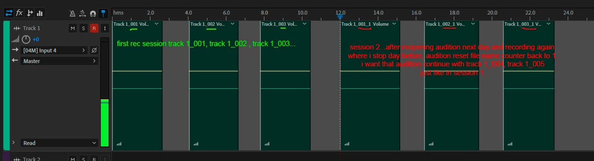 BUT, adobe audition reset counter when i continue to record next day on same track, look at attached picture...track 1_001_1, track 1_002_1.