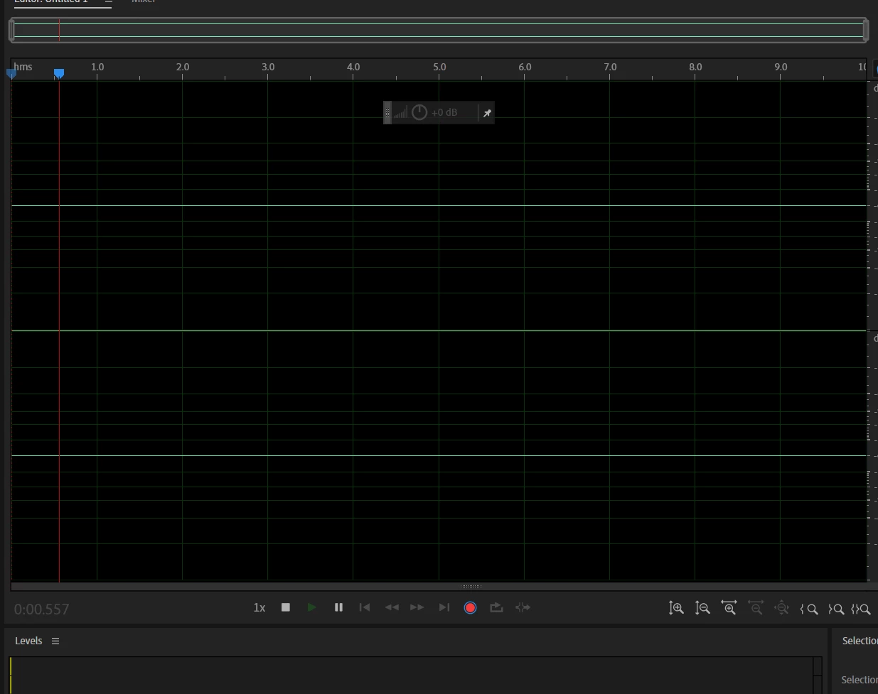 Now, when I hit record, the cursor moves at a glacial pace and doesn't pick up any actual audio. I have no levels either. I do not believe it is an issue with my microphone/RodeCaster because I have levels there and recording works fine in Audacity. It also continues even if I do switch back to my laptop mic/speakers.