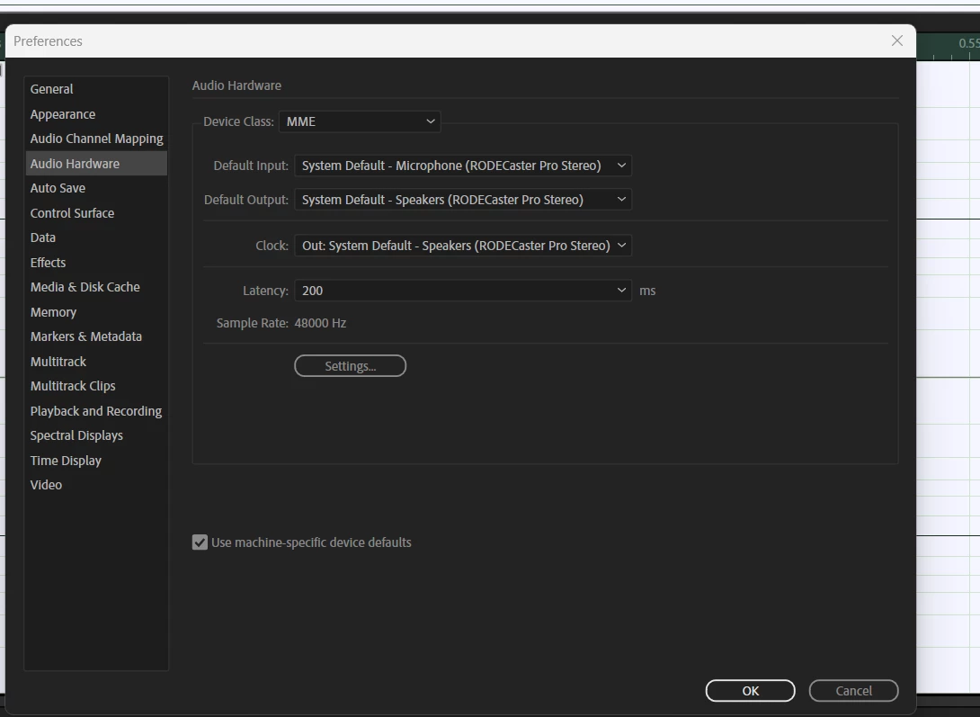 When I opened Audition, it told me that my audio preferences had changed and asked if I was okay with that. I said yes because I had just turned on my RODECaster and figured it was switching from the computer microphone to that.