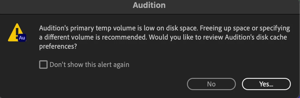 It says that my “ Auditions primary temp volume is low on space. Freeing up space or specifying a different volume is recommended. Would you like to review Auditions disk cache preferences?”
