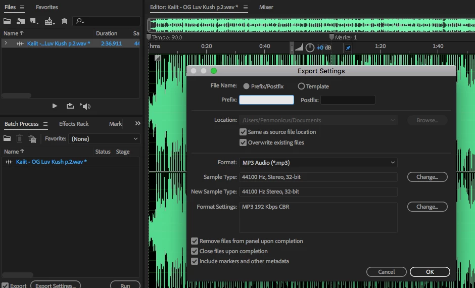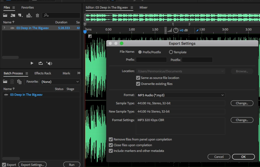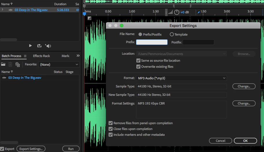 2. I've clicked the "Change..." button next to Format Settings and changed from 192 Kbps to 320 Kbps, then clicked "OK" and clicked the "Run" button in the Batch Process window. This exports the file as a 320 Kbps MP3 and closes the WAV file as wanted.