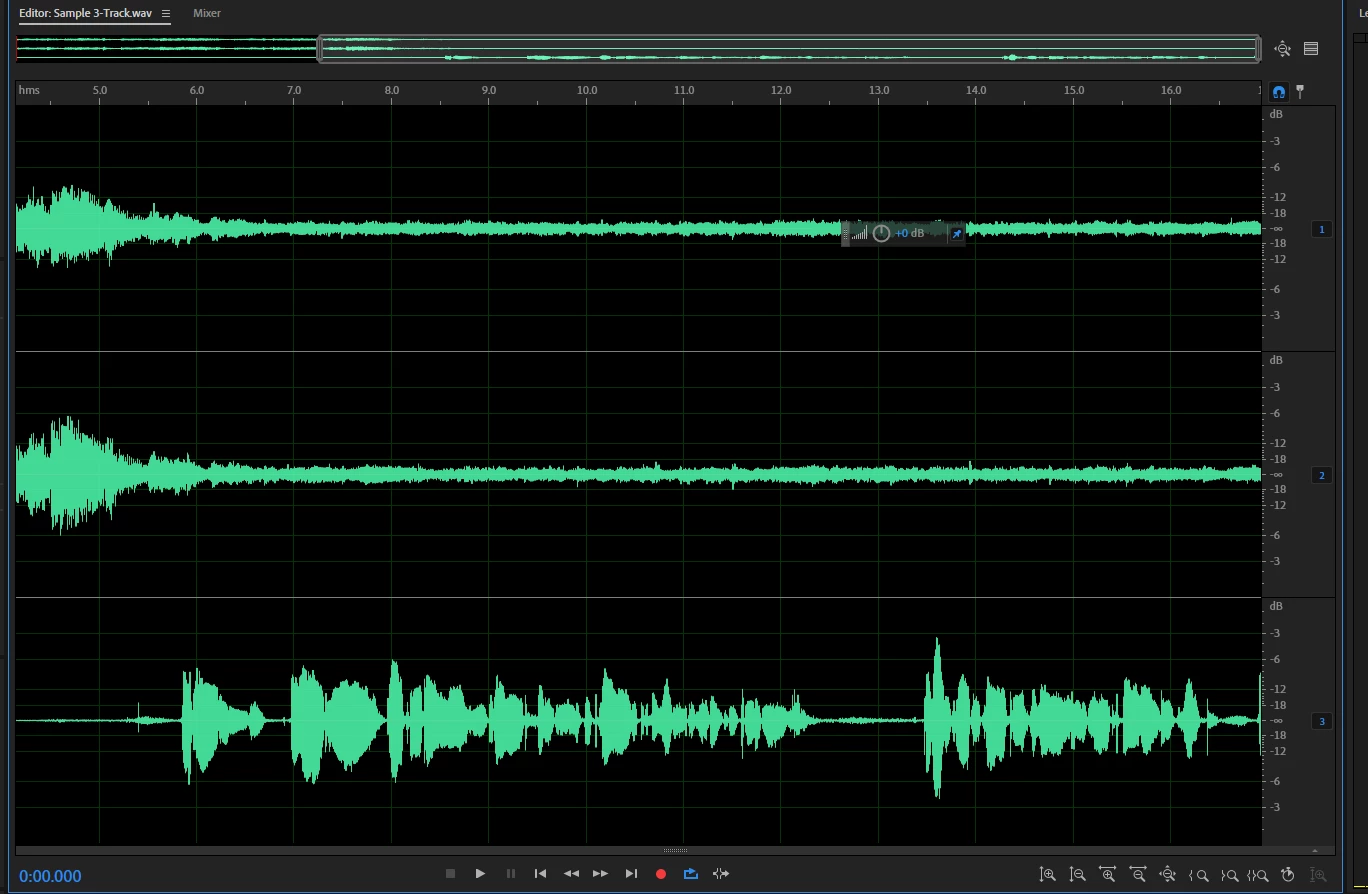 I have some 3-track recordings from a Tascam 144 cassette, recordings made in the 1980s (stereo soundtrack on Tr1-2, commentary on Tr3). They are Wave files. When I open the recording, all three tracks appear, but only the top two are audible.