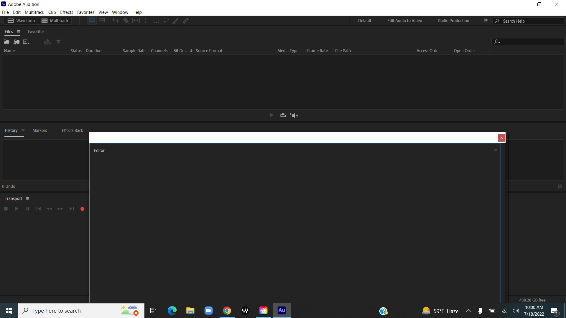 Hello! All of a sudden, my Editor is undocked, and I can't redock it in the Classic Workspace. No docking zones appear, my file panel takes up the entire upper section of the window, and no resizing icon appears to size it left to right. I can size it up and down, but want the File window on the left side of the Editor window. Any help would be super appreciated. Thank you! Also, no docking zones appear in any workspace. If I undock anything, that's it. My Audition i s up to date.
