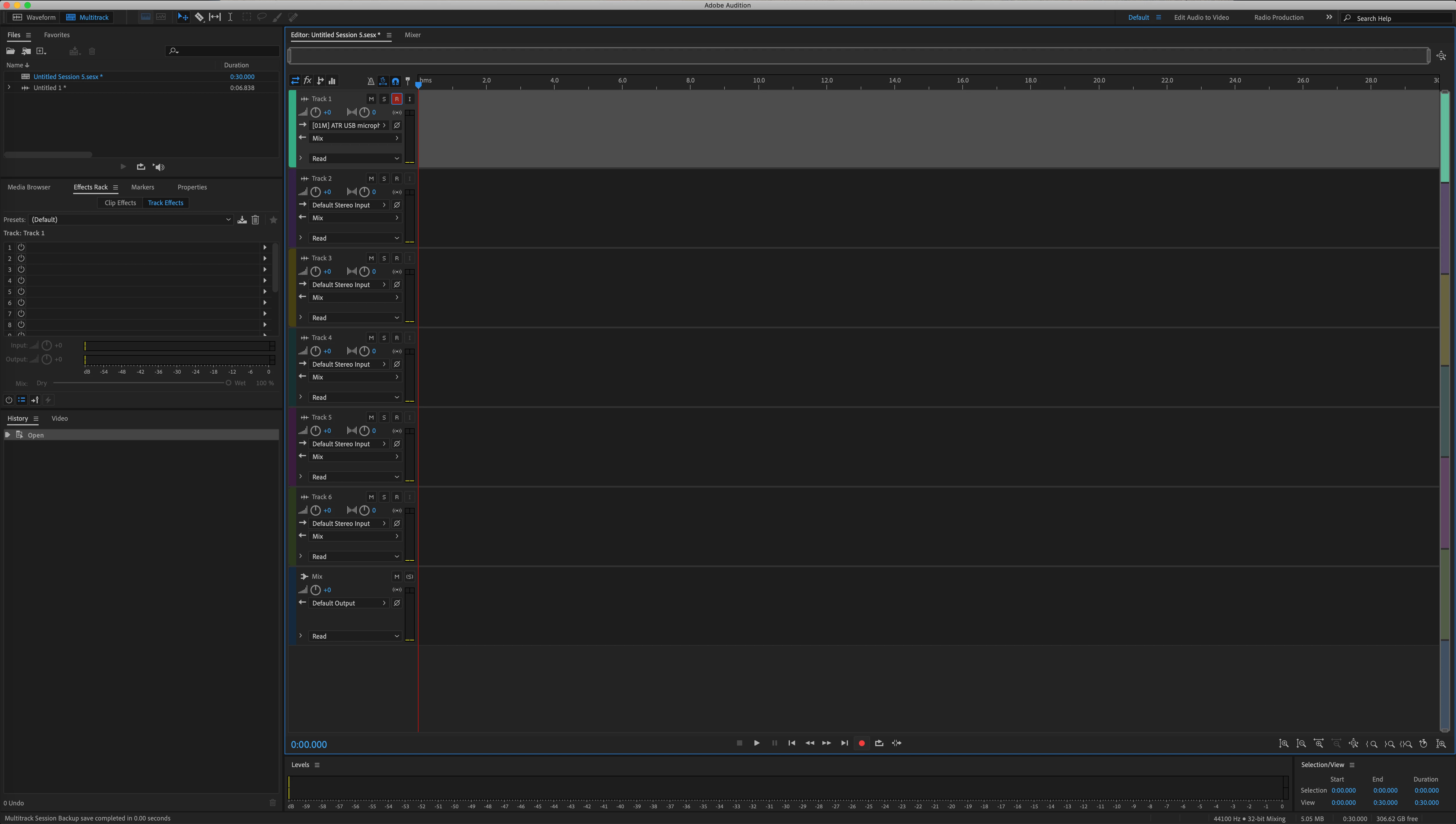 I also tried a multitrack session, and armed the input to record, and then pressed the record button. The time indicator started moving, but no indivation of any signal from the mic.
