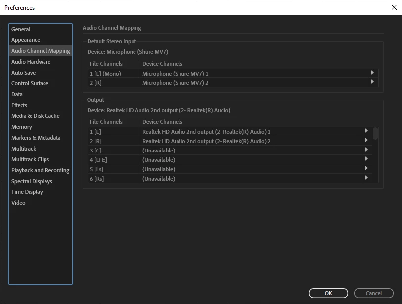 I just installed Audition, but I'm not getting any sound through my headphones. I can hear in other applications (youtube), and the output selection on both Audio Channel Mapping and Audio Hardware are both correct (see screenprints below). The waveform is showing and the section below shows the levels.
